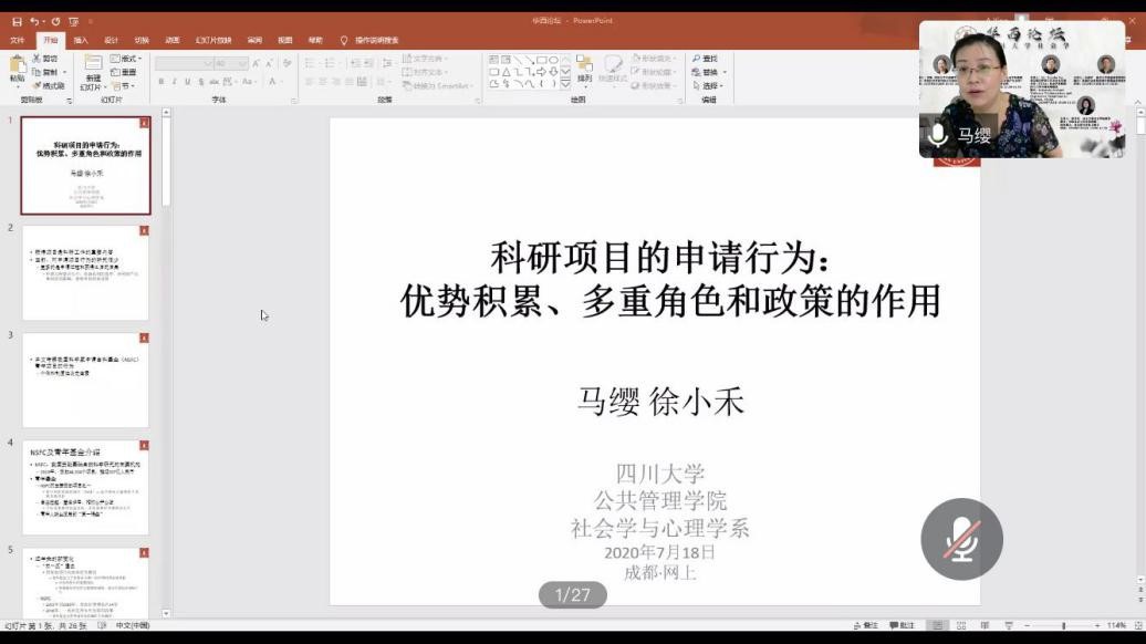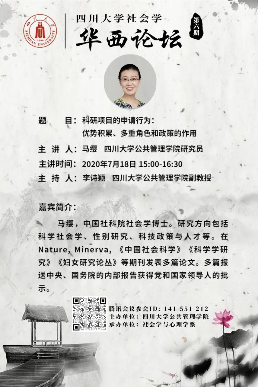 2020年7月18日下午15:00,四川大学社会学华西论坛云系列讲座第六期于线上成功举行。四川大学公共管理学院社会学与心理学系马缨研究员发表了题为“科研项目的申请行为:优势积累、多重角色和政策的作用”的精彩演讲。讲座由社会学与心理学系李诗颖副教授主持,百余名来自我校和省内外兄弟院校的师生参加了讲座。