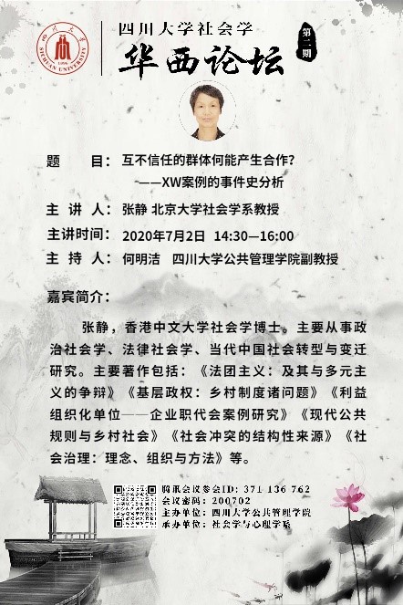 7月2日下午14:30-16:00,由社会学与心理学系承办的四川大学社会学•华西论坛第二期讲座顺利举行。论坛特邀北京大学社会学系博士生导师张静教授主讲,我院社会学与心理学系何明洁副教授主持讲座,社会学与心理学系师生,以及兄弟院校相关专业研究人员300余人参加。