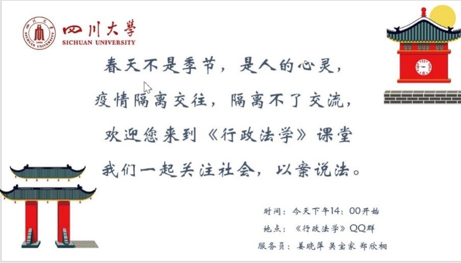 如姜晓萍教授《行政法学》所授的课程,为上好特殊时期开学第一课,开课前整个课程服务团队便做了科学合理的规划与准备,从“以老师为核心的课程内容准备、以助教为核心的课程规范准备、以课代表与同学们为核心的课程参与准备”三条“战线”备战。课程伊始,姜晓萍教授结合当前社会热点,将“抗击疫情中的法律问题”作为课程导言切入,以案说法积极引导同学们在云端课堂的热烈讨论;课程中她与几位同学实时连麦互动,针对具体问题讨论其法律内涵;最后,她在线为同学们“说文解字”阐明“法”字的渊源与核心价值,并布置课后作业。