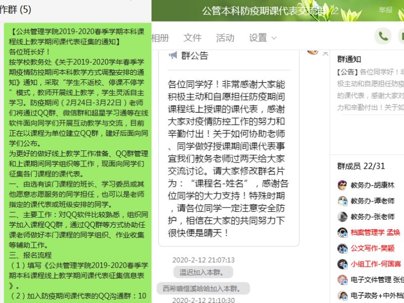 为更好地做好线上教学准备、QQ群管理和上课期间同学组织等工作,学院面向在校本科生征集志愿者,担任线上课程“课代表”(主要动员选有该门课程的班长、学习委员或其他愿意志愿服务的同学担任),并建立“公管本科防疫期课代表”QQ交流群。