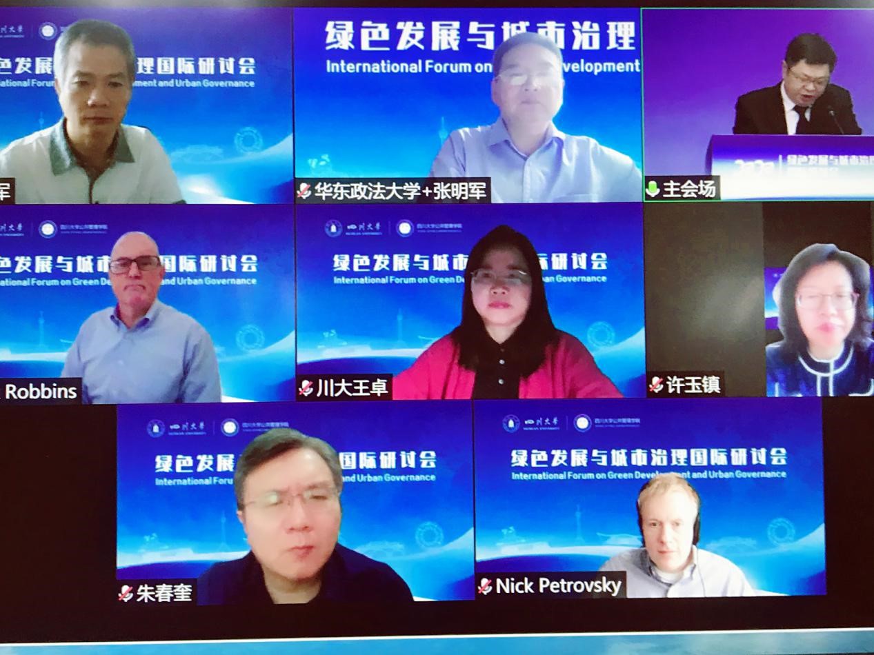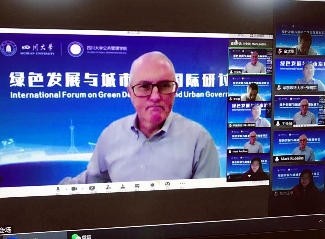 2020年9月26日,由四川大学主办、四川大学公共管理学院承办的2020年“绿色发展与城市治理”国际研讨会在成都举行。本次会议主要采用腾讯会议和ZOOM平台线上形式举办。四川大学党委副书记郭勇、中国社会科学院政治学研究所党委书记房宁、华东政法大学副校长张明军、美国康涅狄格大学公共政策系系主任Mark Robbins、四川大学社会科学研究处处长傅其林等嘉宾出席了开幕式,来自美国宾夕法尼亚州立大学、香港中文大学、香港城市大学、清华大学、中国人民大学、复旦大学、上海交通大学、南京大学、南开大学、北京师范大学、山东大学、华中科技大学、中国科学院、中国社会科学院等国内外知名高校、研究机构、期刊社的百余名专家学者与会云端。开幕式由四川大学公共管理学院院长史云贵主持。
