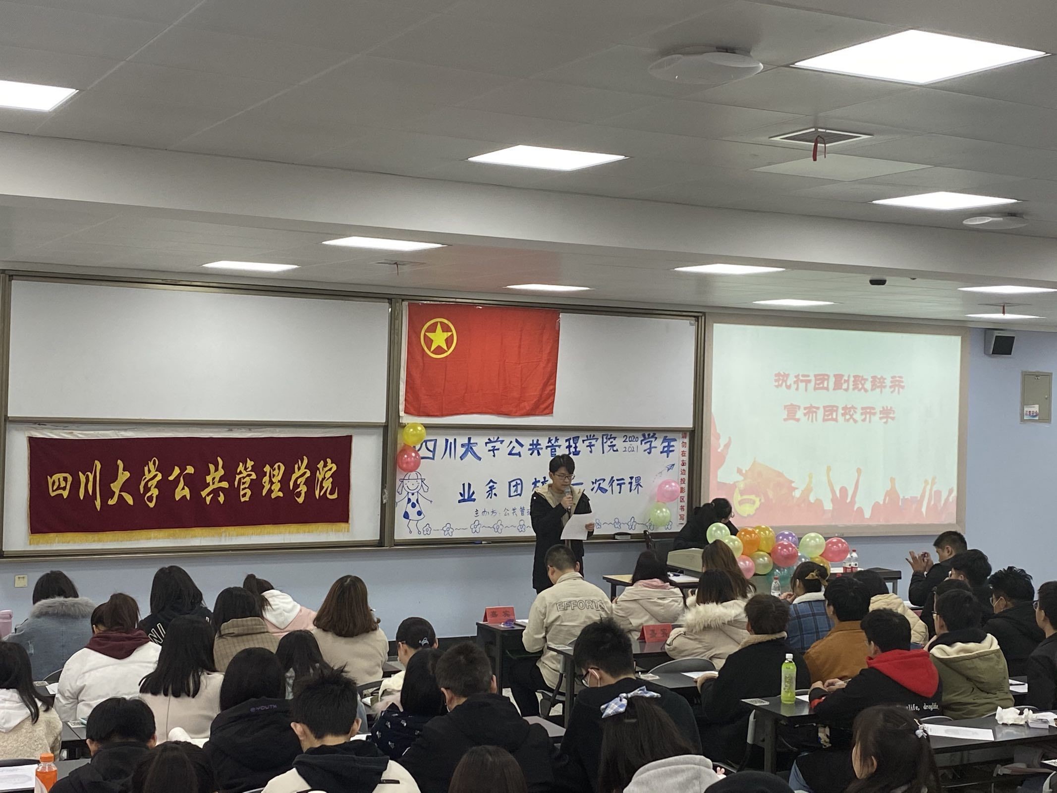 2020年11月29日9:00-11:00,四川大学公共管理学院2020-2021学年团校开学典礼暨第一次行课在江安校区一教B407成功举办。为帮助新生团员同学们更好地融入大学学习生活,培育有理想、有信念、有本领、有担当的时代新人,学院团委组织开展了公共管理学院新学年团校,团校由学院团委组织部承办。本次团课邀请到校团委素质拓展部部长张韵老师来为同学们授课,学院团委书记青杨媚老师、团校主要负责同学和205位团校学员参与了本次活动。