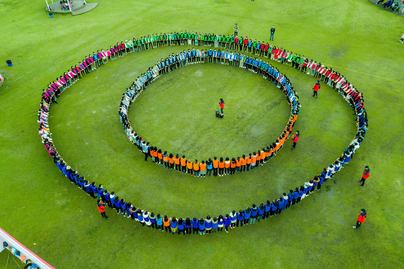 在初步构建彼此信任基础上,在心理和体能得到充分准备后,8支队伍分为两组进行团队竞赛大比拼。竞赛中,无论是“跨越沼泽”还是“旱地龙舟”,都展现出团队间彼此信任、相互帮助。在合作中,有的同学主动站出来指挥队员分工协作;有的同学思路清晰,积极支招;有的同学活泼开朗,负责气氛带动,加油号子喊得十分响亮。一番激烈的竞技比赛后,同学们的默契度和信任感得到增强。最后,近400名同学再次汇聚一起,共同拾起两圈坚实的长绳,手牵手、肩并肩组成人墙,开始了体力与毅力的终极考验项目——众人划桨士气高。活动中,所有人需用力紧绷身前长绳,8名队长站在绳上环绕一圈扮演“船长”角色,伴着激昂的音乐和长绳“海浪”,“船长”要在绳子上前行。此项团队合作活动,即锻炼胆识,又熔炼团队精神。