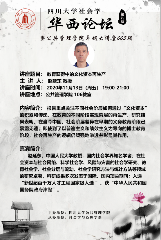 2020年11月12日晚上19:00-21:00,四川大学社会学华西论坛系列讲座第九期——暨公共管理学院卓越大讲堂005期于公管院106成功举行。中国人民大学社会学系教授赵延东发表了题为“教育获得中的文化资本及其再生产”的演讲。讲座由四川大学社会学与心理学系马缨研究员主持,40余名各专业师生参加了讲座。