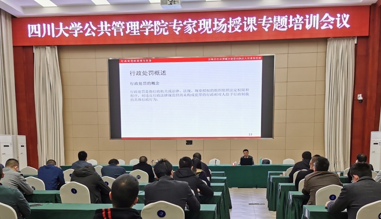 四川大学公共管理学院特邀专家、法学院副教授邹奕主讲了题为“行政处罚的原理与实务”的培训课程。邹老师通过精致的课件设计、有针对性的大量实战案例、亲切生动的授课风格,条理清晰、深入浅出地引导学员们领悟了行政执法的一般程序,细致分析了城市乱搭乱建以及“小产权房”的治理和处理案例,针对落实行政执法“三项制度”组织了讨论学习。在培训中学员们实现了观念更新、技能优化和能力提升,他们表示收获很多、希望未来能够举办更多的类似培训。