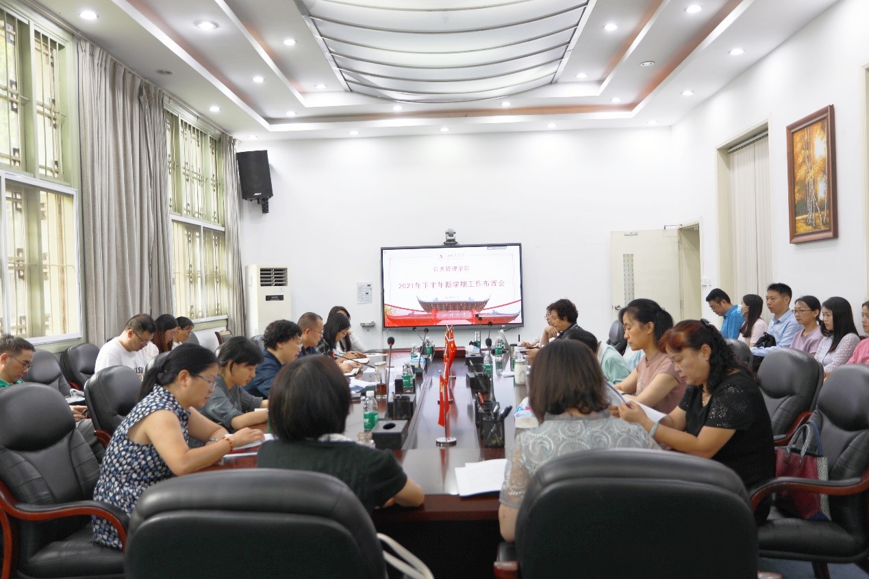 9月1日下午,我院在萃文楼三楼会议室召开2021年下半年新学期工作布置会,学院班子、两委委员、支部书记、系主任、科级干部及全体教职工参会。会议由学院党委书记姜晓萍教授主持。