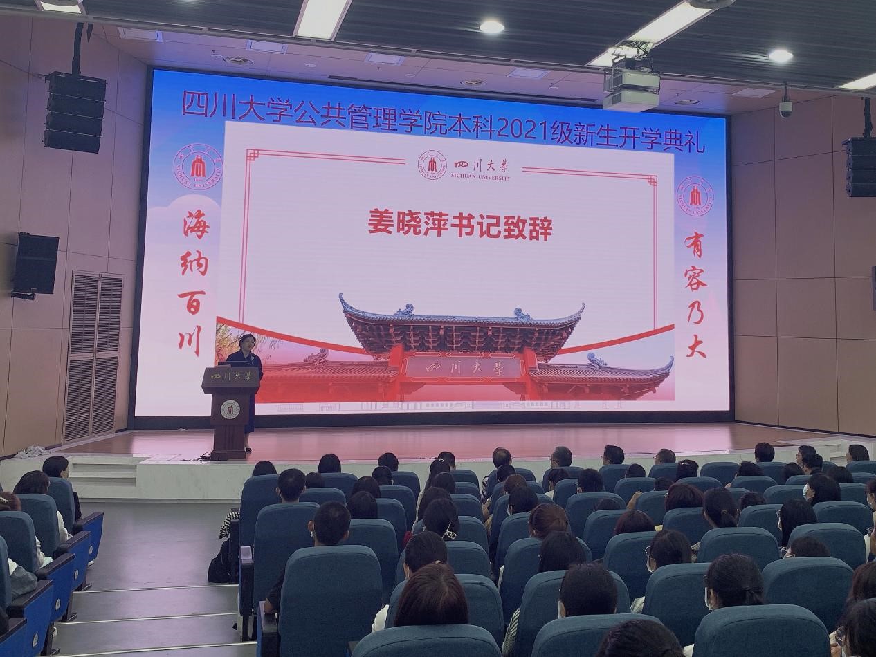 2021年9月7日上午,四川大学公共管理学院2021级本科生开学典礼在江安校区水上报告厅成功举行。四川大学公共管理学院党委书记姜晓萍教授、院长史云贵教授、党委副书记兼纪委书记杨磊副教授、副院长夏志强教授和罗亚玲副教授,学院各系、各部门教师以及2021级全体本科新生参加了典礼。罗亚玲副院长主持本次开学典礼。