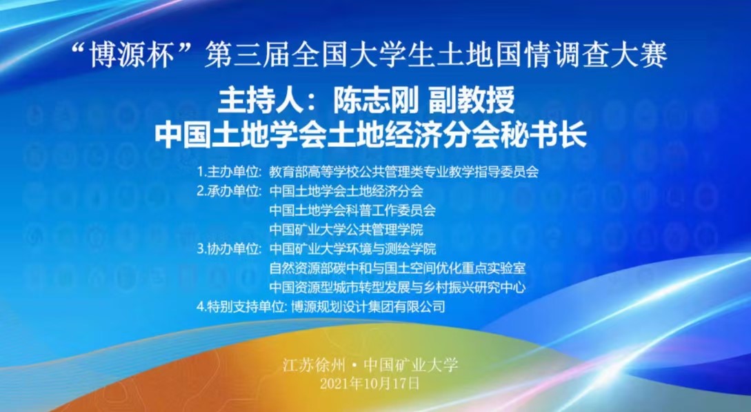 2021年10月17日, “博源杯”第三届全国大学生土地国情调查大赛决赛在中国矿业大学举办。该大赛由教育部高校公共管理类学科专业教学指导委员会主办,中国土地学会土地经济分会、科普工作委员会和中国矿业大学等单位承办。大赛主题为“国土空间优化与区域协调发展”为主题。