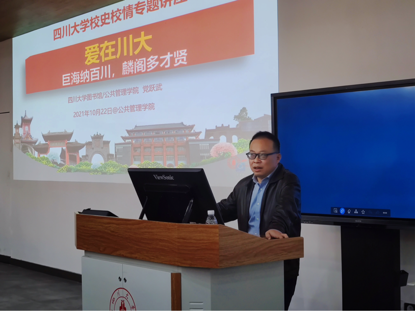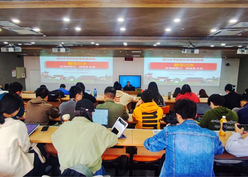 为促进我院学子对我校基本情况的了解,感受四川大学历史底蕴,鼓励学子从校史中汲取四川大学优秀文化与精神品质,2021年10月22日下午两点,公共管理学院在基础教学楼C座101教室顺利开展了研究生综合素质课的学习活动。本次课程以“校史与校情”为主题,以我院2021级全体硕士研究生为授课对象,由四川大学图书馆馆长、公共管理学院教授党跃武老师主讲。