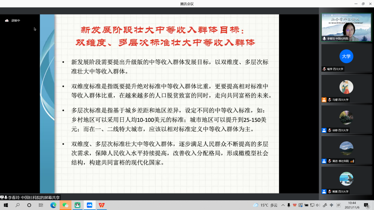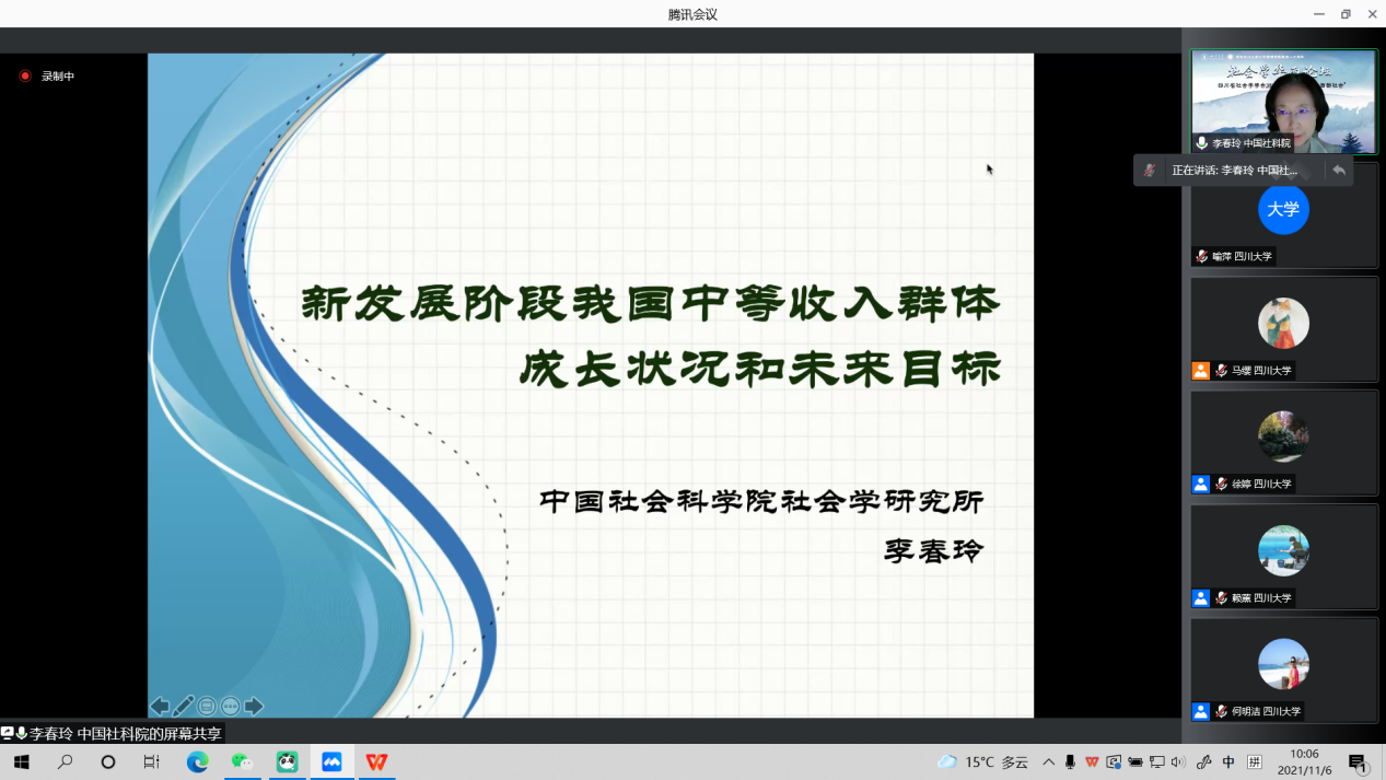 2021年四川省社会学年会于11月6日在四川大学公共管理学院召开,此次会议采取线上的方式举行,有近200人参与了此次年会。中国社会科学院社会学研究所研究员、博士生导师、青少年与社会问题研究室主任李春玲在大会上围绕“新发展阶段我国中等收入群体成长状况和未来目标”做了主题发言。