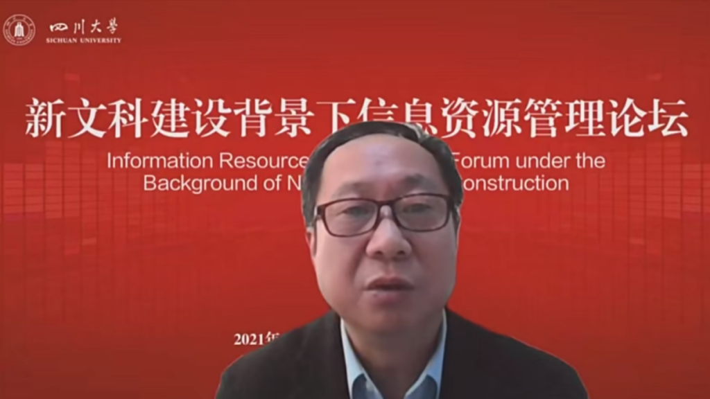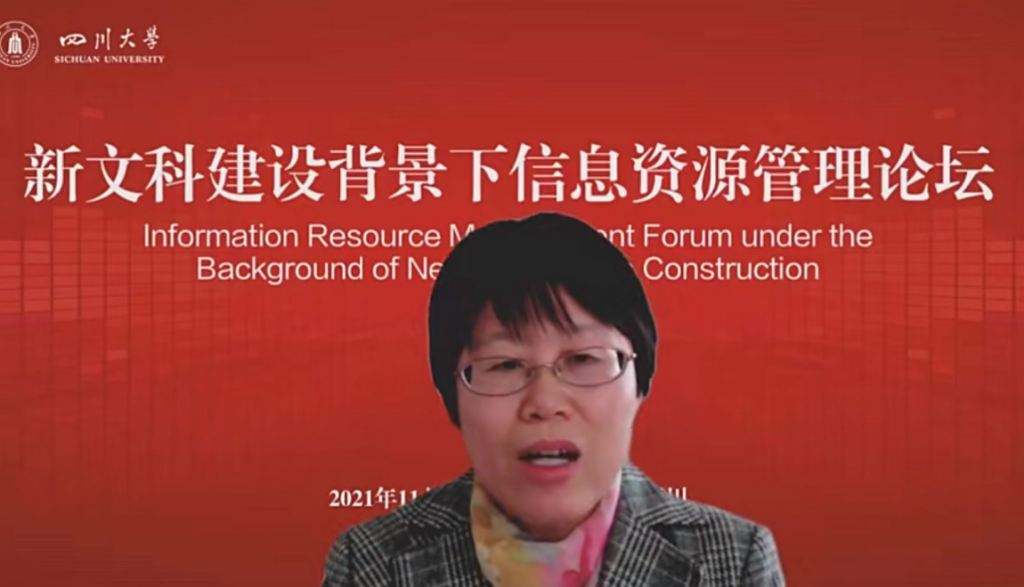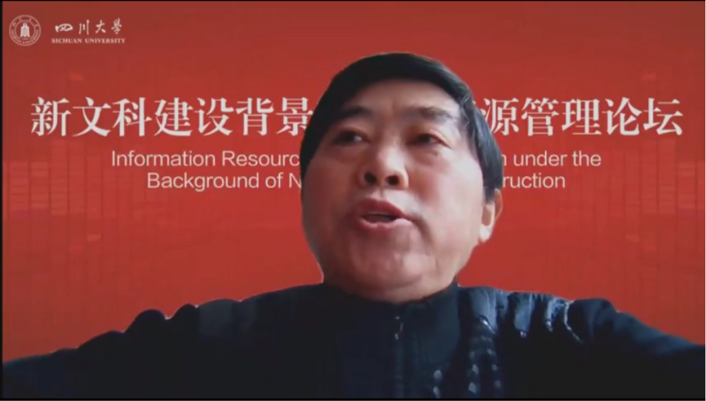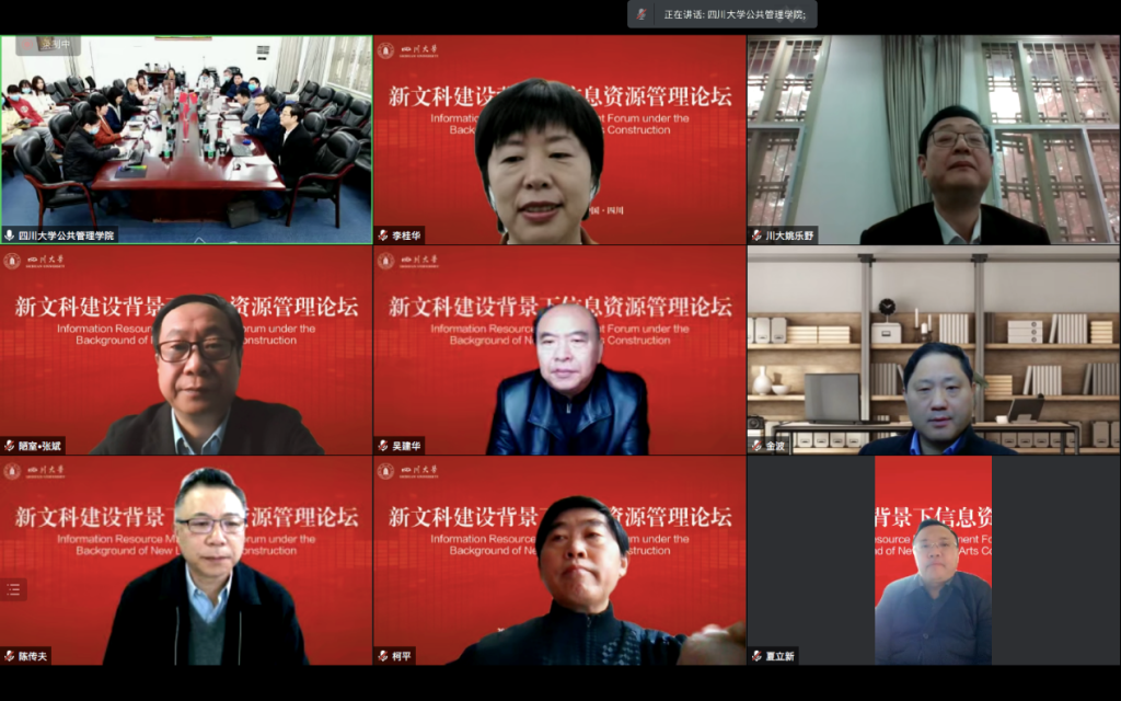 2021年11月28日上午,“新文科建设背景下信息资源管理论坛”在四川大学望江校区举行。会议采取线上线下相结合的方式,主会场设在四川大学公共管理学院311会议室。来自全国的教育部图书馆学教学指导委员会和档案学教学指导委员会教育专家,四川大学副校长姚乐野教授,四川大学图书馆馆长党跃武教授,以及信息资源管理专业教师赵媛、罗骏、纪希禹、马蕾、史坤蓉、李桂华、袁莉、杨峰、范炜、吕鹏辉、周良、杨海娟老师等30余位师生出席本次会议,云端相聚,共议新文科建设背景下信息资源管理发展问题。