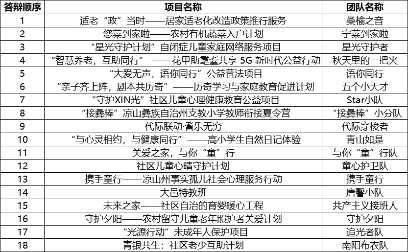 18支参赛队伍经过激烈角逐和评审小组的专业考察,得分最高的3个项目获得推荐资格,将参加2021年12月在四川省社会组织孵化园举行的全省决赛。3个优胜项目分别是: