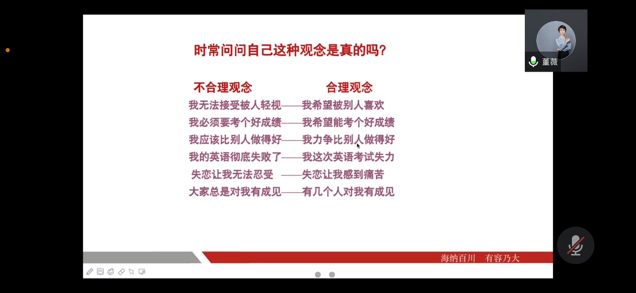 而后董薇老师为同学们分析了考研前各种负面情绪的产生过程,是从一个事件激发起对这一事件的认知,再在这种认知下产生身心感受,这种感受让人想对外输出能量,最后在这股能量支配下产生行动。由此出发,董薇老师介绍了费斯汀格事件重新整理法,通过重新拆解情绪产生过程,将客观事实转变成自我关怀,进一步止恶扬善。