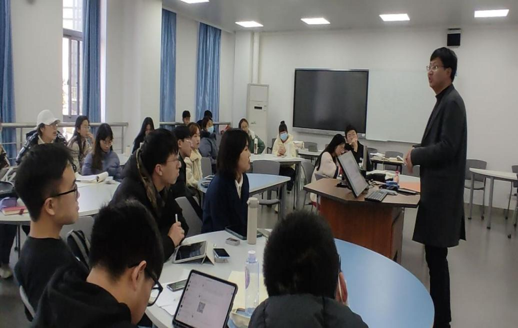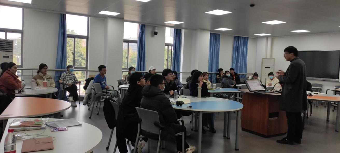 大学生为什么要读书?在讲述这个问题的时候,刘老师以真实发生在自己身边的事例来篇,“有的同学一次性读好多本书、一次忙好多课题……这样很多时候就丢失了自己读书的本心”,以此一步步揭示了小资产阶级式的读书和激进式读书的病态和弊端。并一步步引导同学们明白“读书无用之大用”的本质。在“卷”的时代,读书的态度也该摒弃功利性的目的,要怀揣希望和梦想,以发展的眼光看待读书之功用,要“为中华之崛起而读书”,要在“山花烂漫、无忧无虑的阶段多读书、读好书。”同学们深受感染,不断陷入思考。