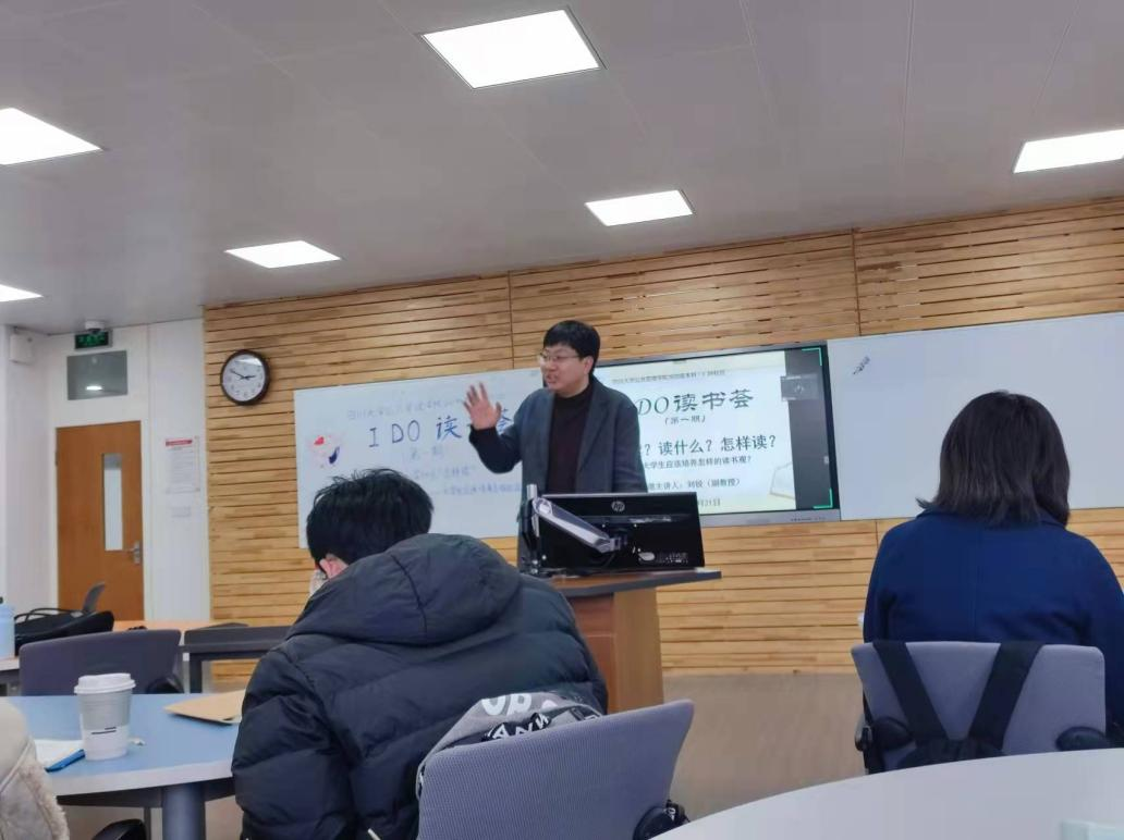 “I DO读书荟”伊始,苟欢老师首先介绍了IDO读书荟成立的意义、目的以及之后的运行模式,随后,第一期“I DO读书荟”采取特邀嘉宾主题分享-同学自主提问的形式正式进行。刘锐老师紧密结合大学生读书的功用、内容和方法,向同学们分享了“大学生应该拥有怎样的读书观”这一核心问题。