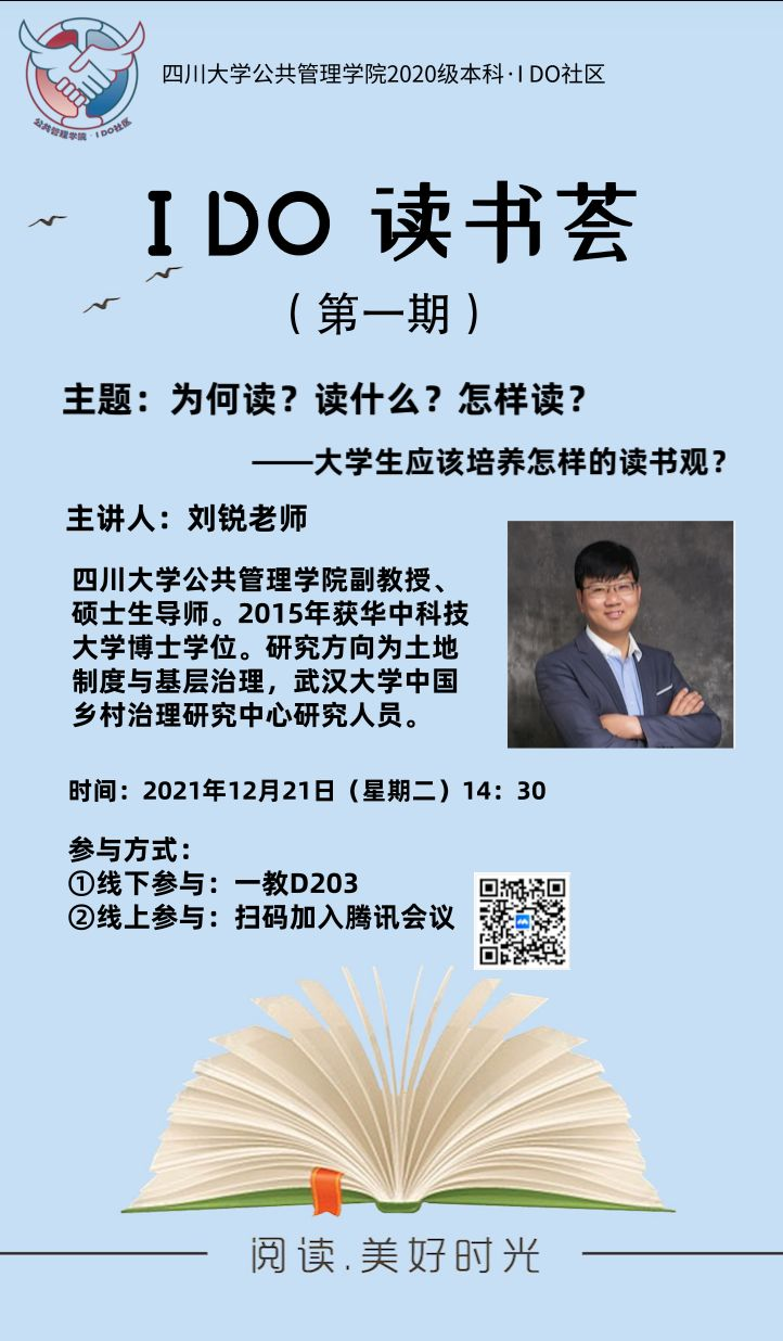 2021年12月21日14:30,公共管理学院2020级本科第一期“IDO读书荟”在江安校区基础教学楼D203教室成功举办。公共管理学院行政管理系刘锐副教授作为特邀嘉宾主讲了本次读书荟,读书荟由2020级本科辅导员苟欢老师主持,2020级本科学生各专业同学通过线下线上的方式参加了本次读书荟。