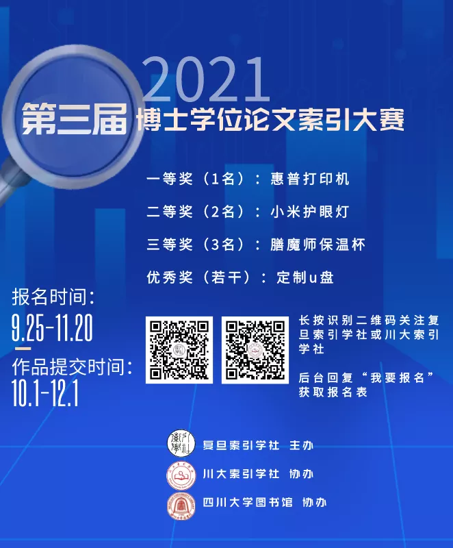 2021年9月26日至12月1日,由中国索引学会指导,复旦索引学社主办,四川大学学术型学生社团川大索引学社、四川大学图书馆协办的第三届博士学位论文索引大赛隆重举行。