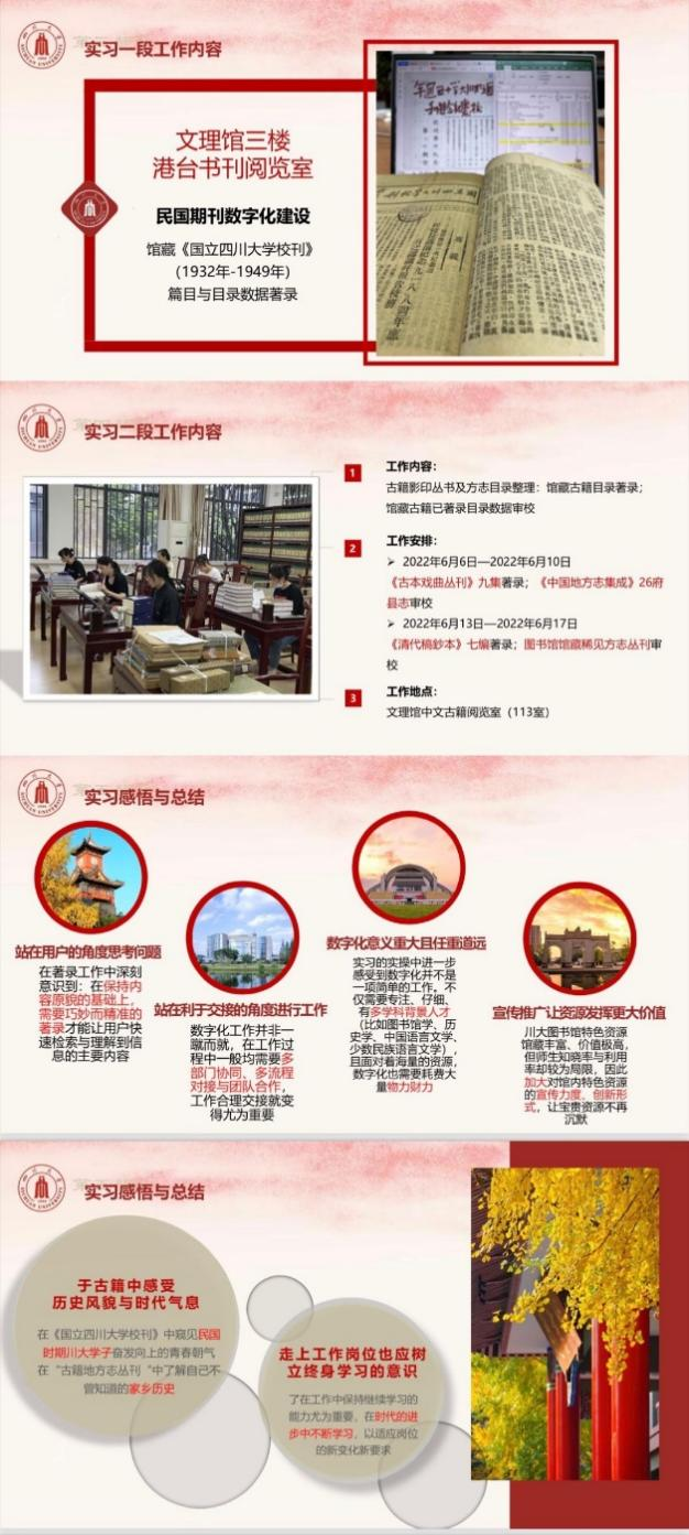 特色资源中心实习小组在实习工作期间著录完成《国立四川大学校刊》(1932 年-1949 年)368 期,4383 个书页,5410条篇目数据,完成《清代稿抄本》七编、《古本戏曲丛刊》九集,共计908册, 2234条数据。审校完成《中国古代地方志集成》26个府县、全国各图书馆馆藏《稀见方志丛刊》等丛书,共计3122册,5128条数据。这些微小、基础的工作一定程度上推进了川大图书馆将现有数字化成果更快、更好地导入线上数据库。工作中人工亲自翻阅纸本原件对资源进行严谨著录与索引,实现信息有序化,将较好地提升日后线上用户检索与利用的效率。