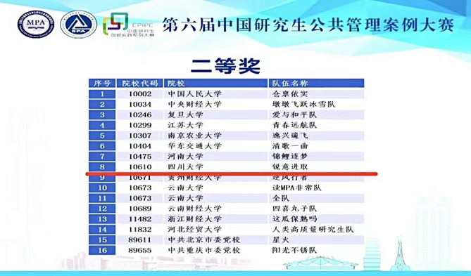 2022年8月14日,第六届中国研究生公共管理案例大赛决赛在河南郑州隆重举行。四川大学公共管理学院喜获佳绩,斩获奖项共5项,其中最佳案例奖1项,最佳指导教师奖1项,二等奖1项、三等奖2项。