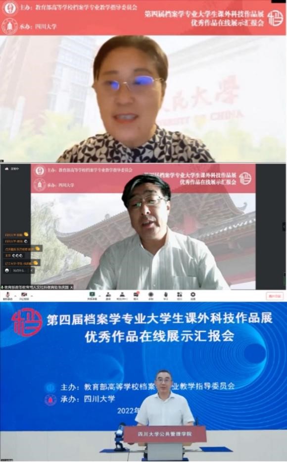 2022年8月28日,第四届档案学专业大学生课外科技作品展优秀作品展示汇报会在云端成功举办。本次作品展由教育部高等学校档案学专业教学指导委员会主办,四川大学承办,以“腾讯会议+直播”的形式进行,线上汇聚领导、嘉宾、高校师生、档案行业人士等近400人,共鉴档案学科创新成果,共窥档案教育发展之道。