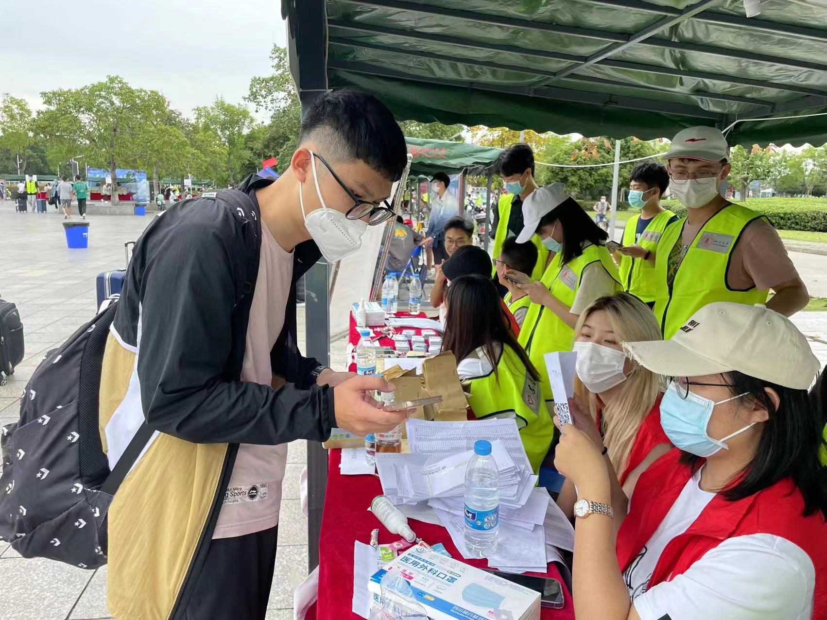 迎新志愿者们为新生提供了从入校接引、行李搬运、流程引导、入住办理的全过程服务。负责接引的志愿者们在校车下车点举着院牌等待新生的到来,待新生下车,他们便会接过新生的行李,引导新生前往报到处。负责报到工作的志愿者们在学院报到处进行着资格确认、信息核实、一卡通及宿舍钥匙发放、物资发放等工作。在报到处流程结束后,志愿者们积极引导新生核酸检测,帮助他们搬运行李并带领他们前往宿舍。