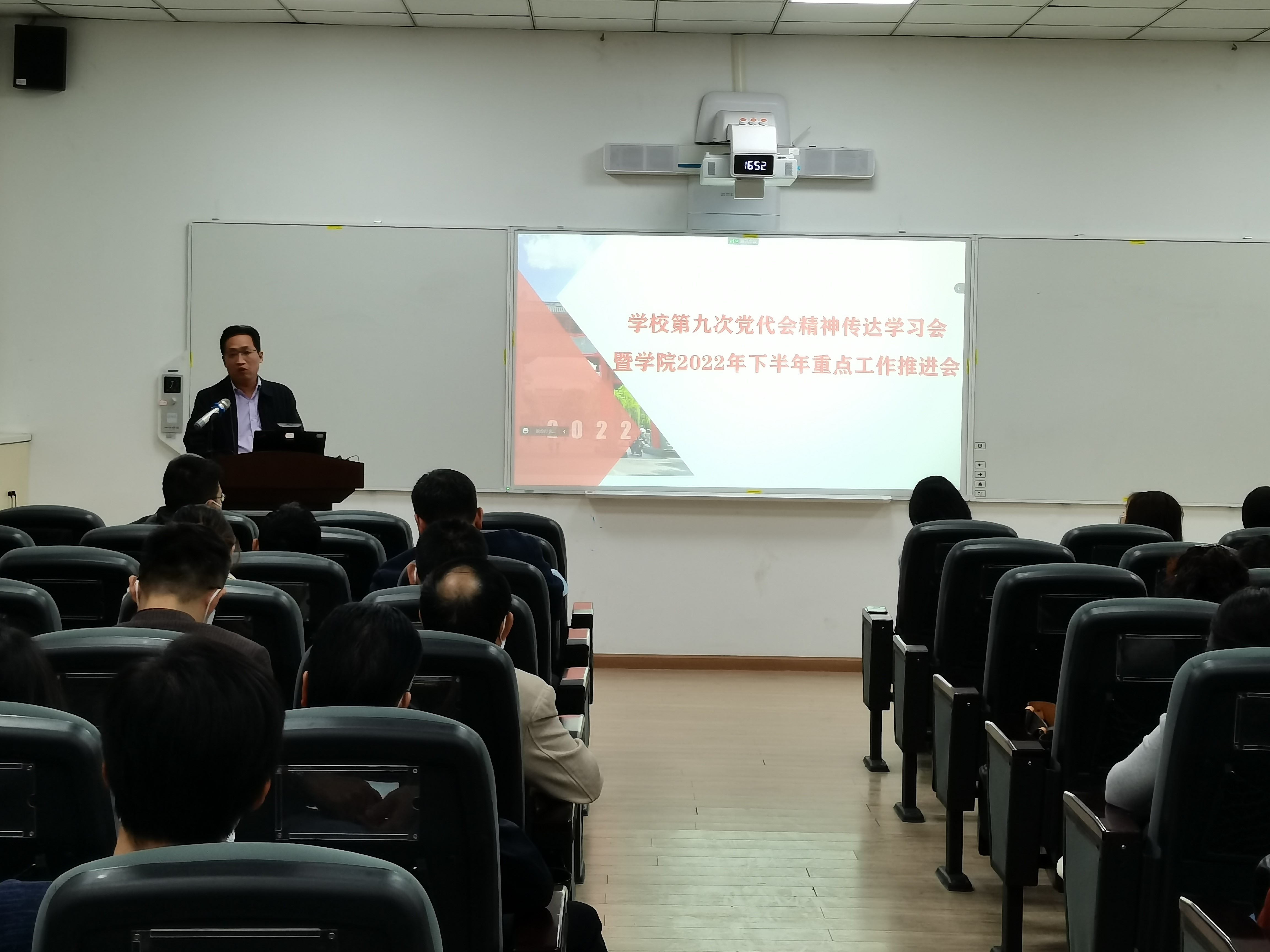 会上,韩杰重点传达学校第九次党代会精神。他强调,学校第九次党代会是在迎接党的二十大胜利召开的重要时刻召开的一次关键会议,对学校和学院当前和今后一个时期的发展具有重要意义。他重点传达了学校第九次党代会的精神实质和核心要义,包括学校第九次党代会主题、学校第八次党代会以来所取得的主要成就和宝贵经验、学校今后五年的奋斗目标、高质量推进学校“双一流”建设和坚定不移推进新时代学校党的建设等。他要求,要认真学习贯彻学校第九次党代会精神,不断提高政治站位,将学校第九次党代会精神植根于思想深处、落实到行动之中;坚持立德树人根本任务,服务学校发展大局,锚定学院中心工作,深入推进人才培养和学科建设;以学校第九次党代会精神为引领,推动学院内涵式发展再上新台阶。韩杰还通报了学校2022年上半年工作总结和下半年重点工作安排。