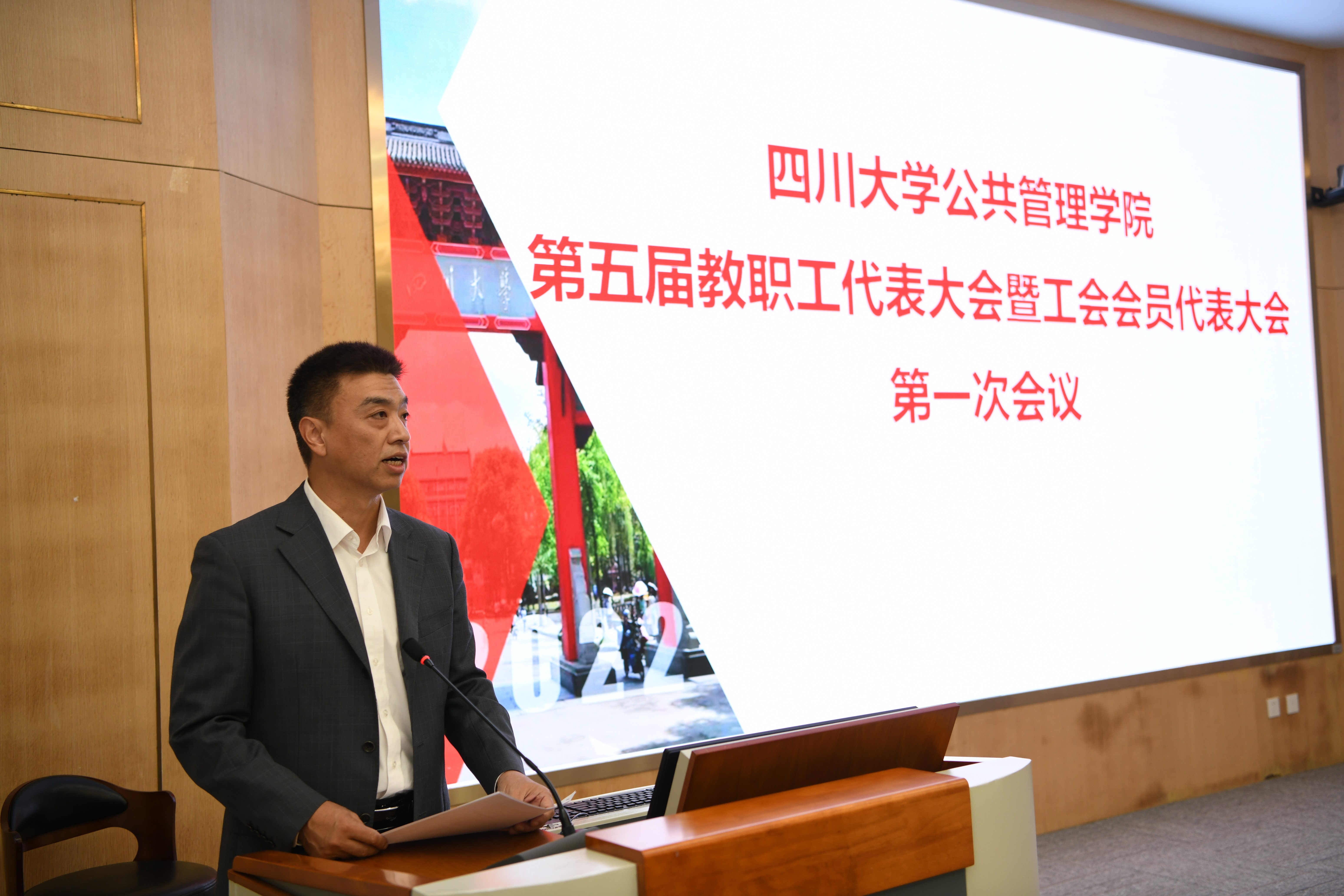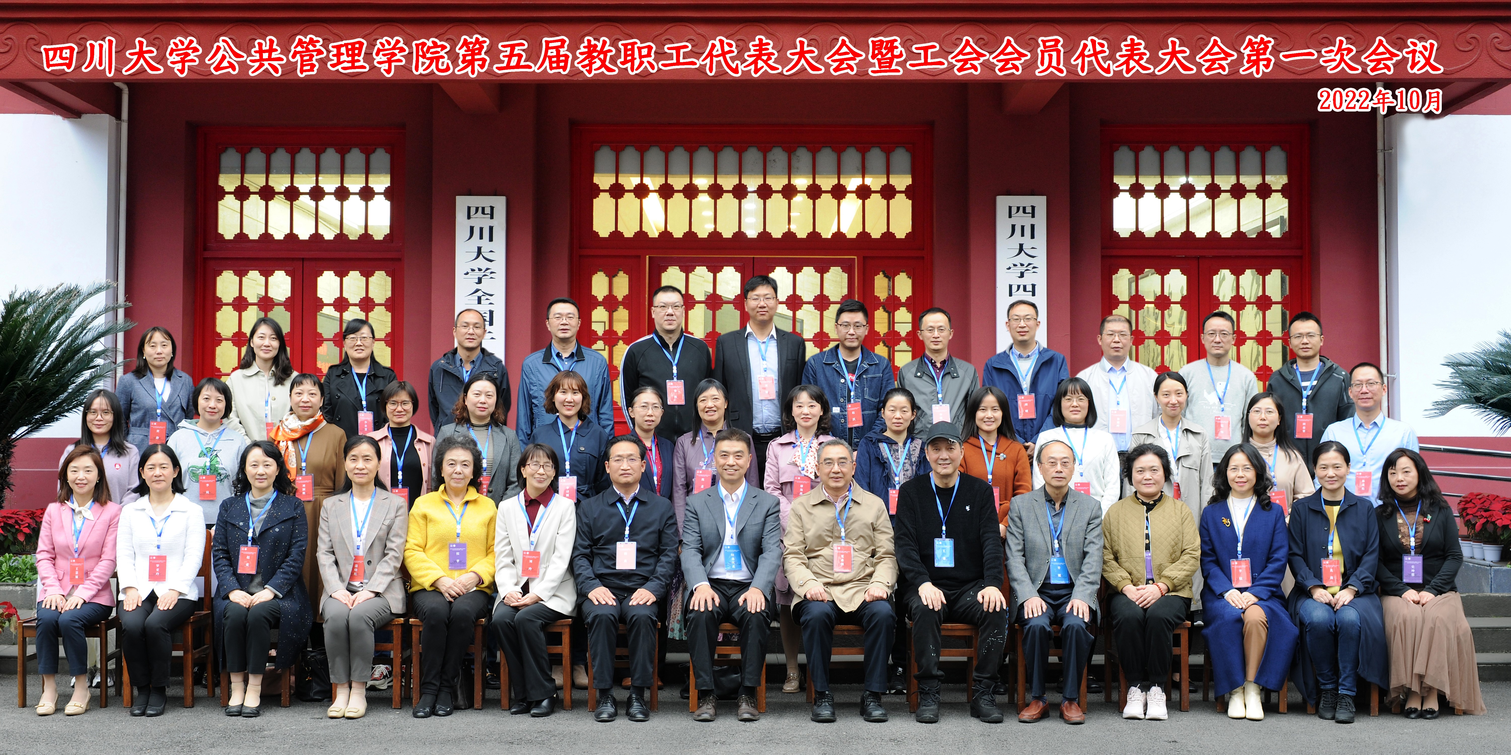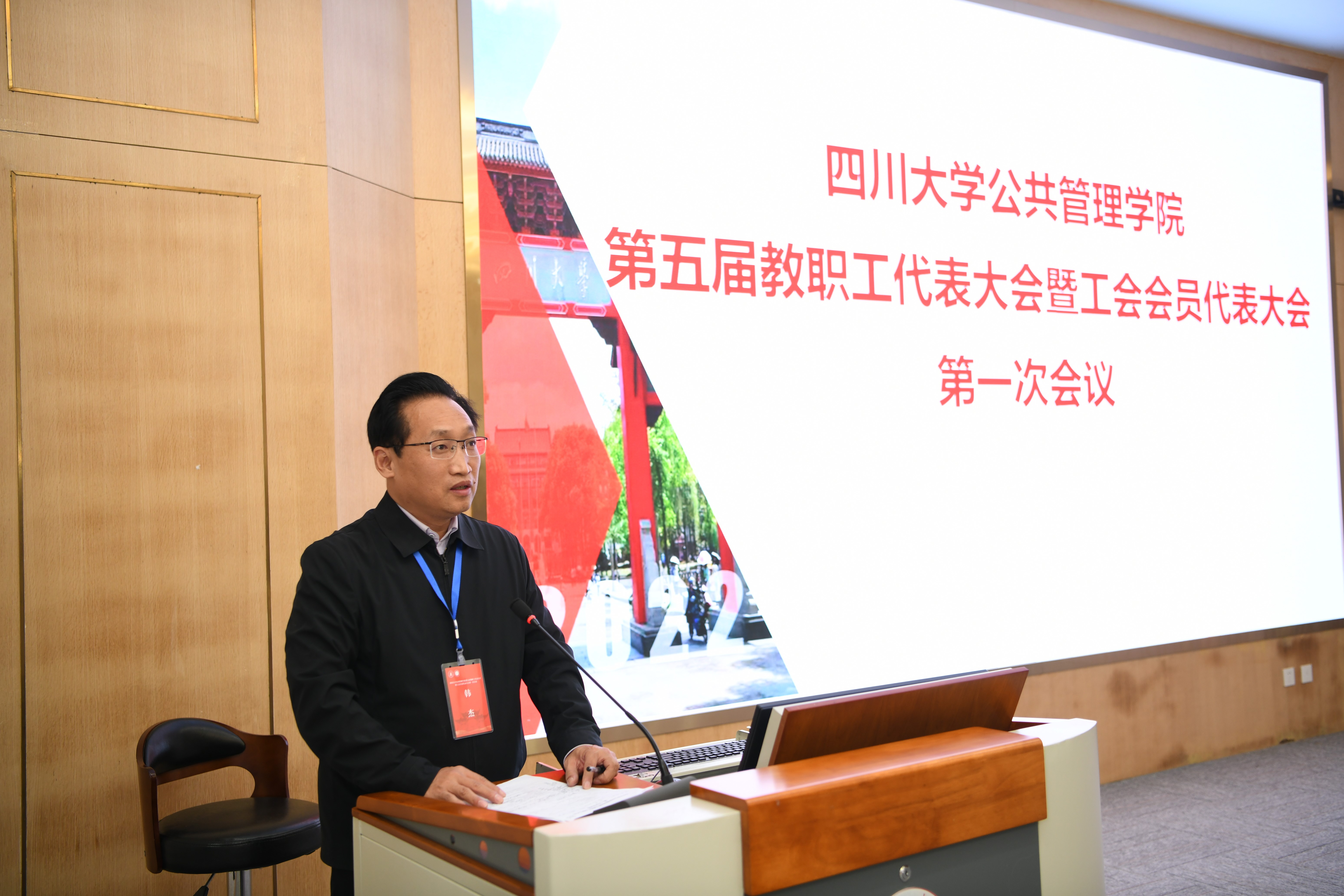 2022年10月14日,公共管理学院第五届教职工代表大会暨工会会员代表大会第一次会议在四川大学全国干部培训基地2号演播厅隆重召开。本次大会的主题是“凝心聚力,开拓创新,促进公共管理学院高质量发展”,四川大学工会副主席吕海涛、学院“双代会”代表、特邀代表和列席代表出席大会。大会由学院党委书记韩杰主持,并致开幕辞。