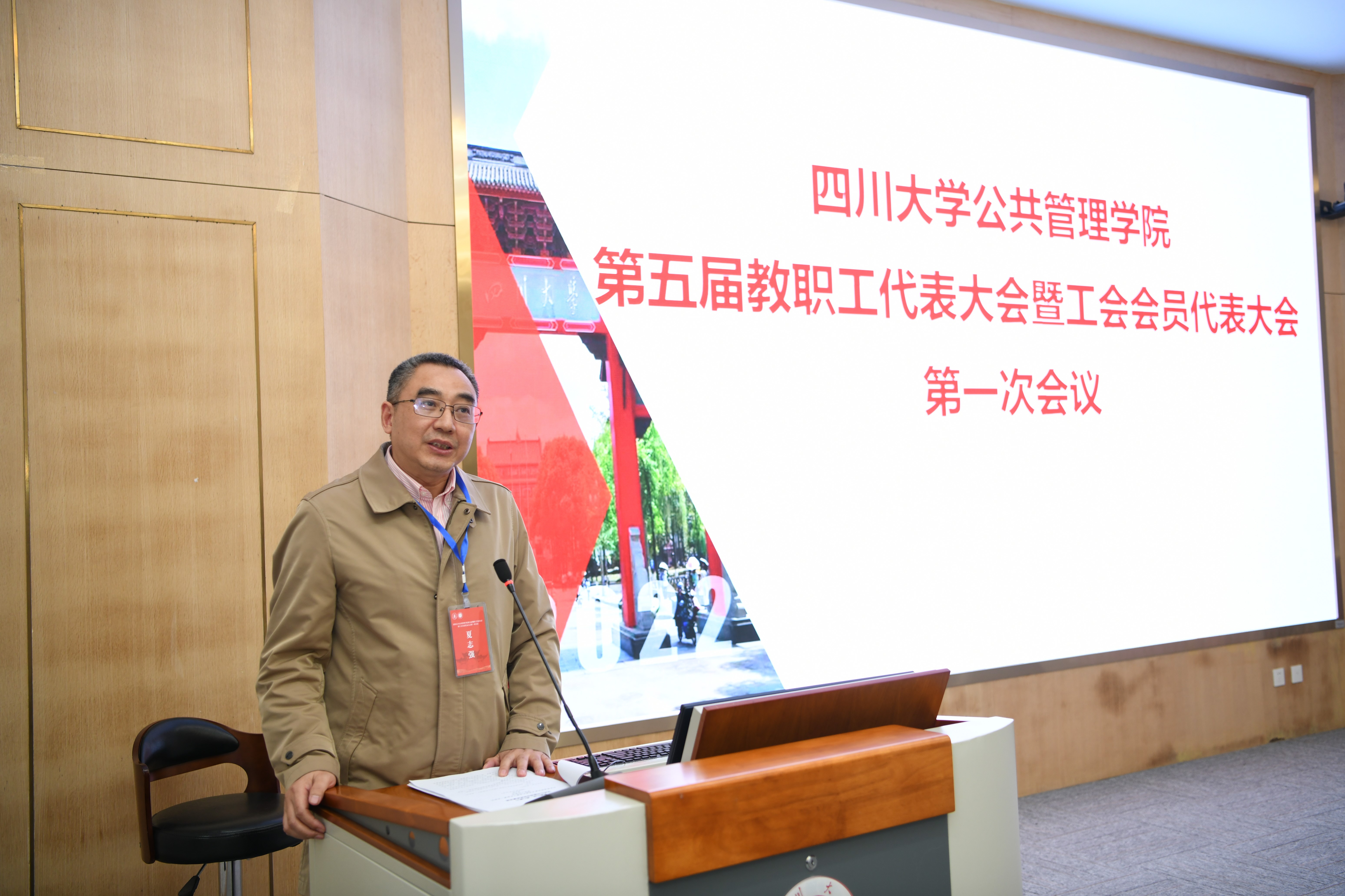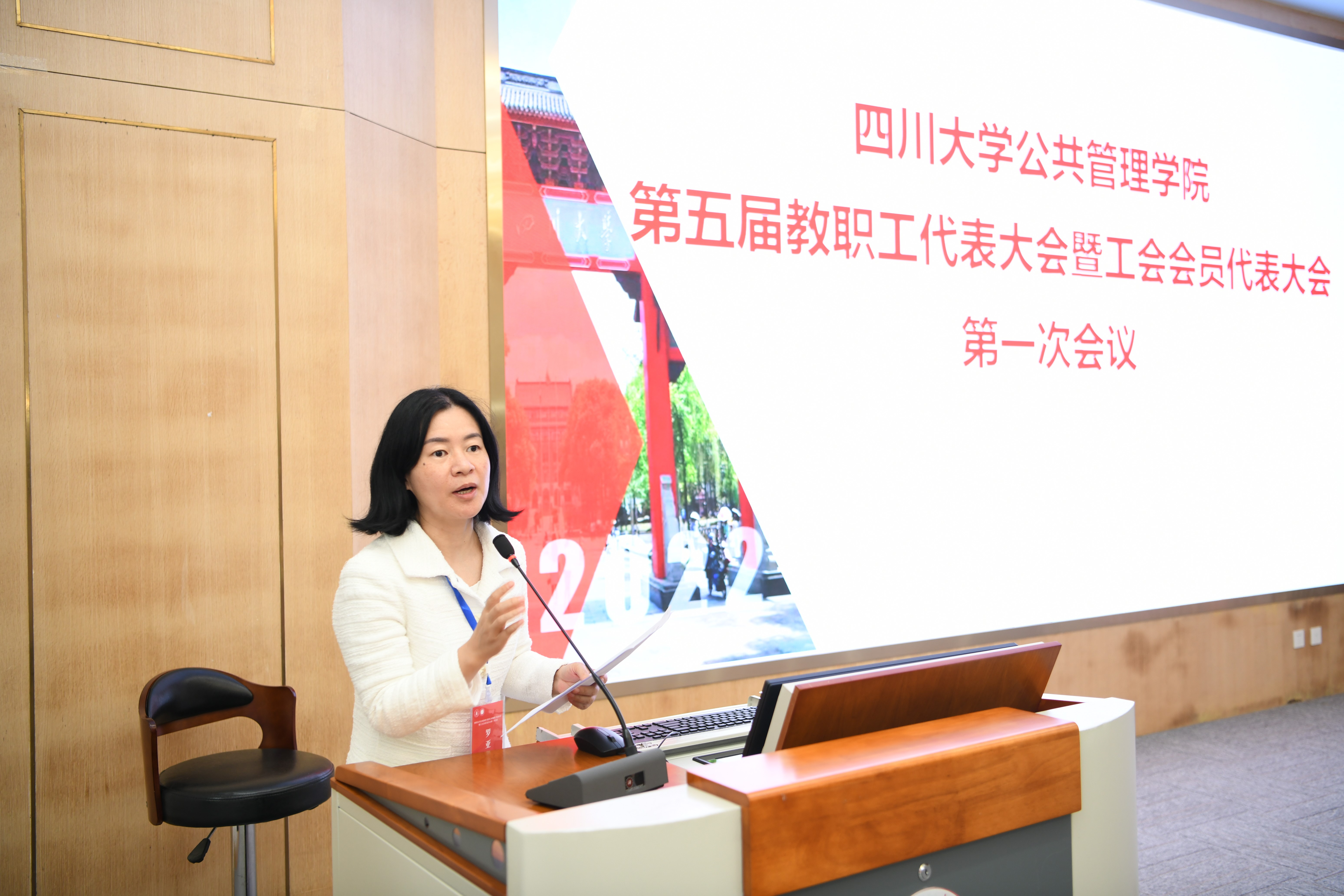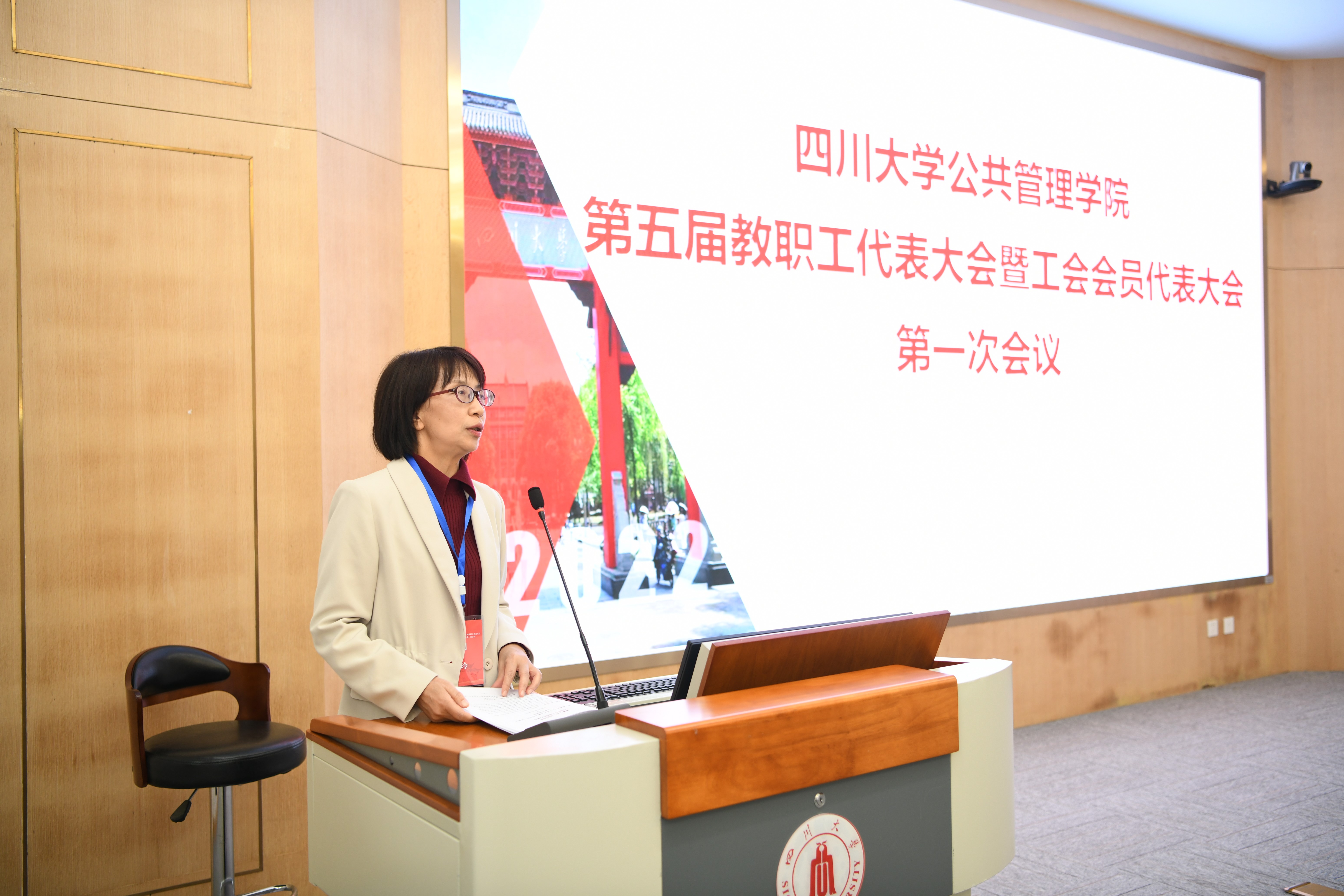 2022年10月14日,公共管理学院第五届教职工代表大会暨工会会员代表大会第一次会议在四川大学全国干部培训基地2号演播厅隆重召开。本次大会的主题是“凝心聚力,开拓创新,促进公共管理学院高质量发展”,四川大学工会副主席吕海涛、学院“双代会”代表、特邀代表和列席代表出席大会。大会由学院党委书记韩杰主持,并致开幕辞。