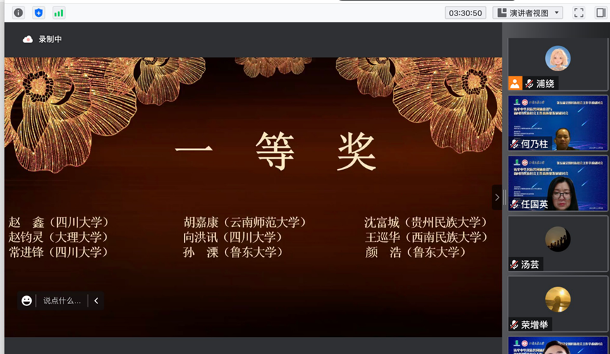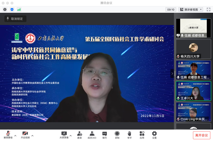 本届会议以“铸牢中华民族共同体意识与新时代民族社会工作高质量发展”为主题。来自四川大学、中央民族大学、厦门大学、西南民族大学、贵州大学、云南大学等40多所高校,80余名专家学者齐聚云端,以铸牢中华民族共同体意识为主线,围绕着中国特色民族社会工作理论和实践成果展开讨论。西南民族大学党委常委、副校长张华志教授,四川省民政厅一级巡视员杨伯明,中国社会工作教育协会副会长庄勇教授,中国社会工作教育协会民族社会工作专业委员会主任任国英教授出席开幕式并致辞。西南民族大学民族学与社会学学院院长蒋彬教授主持开幕式。我院王卓教授应邀担任第一分论坛主持人,并携团队成员常进锋博士、赵鑫同学等参会交流。