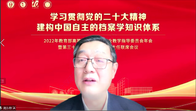 2022年11月12日,由教育部高等学校档案学专业教学指导委员会主办、四川大学公共管理学院与中国人民大学信息资源管理学院联合承办的2022年档案学教指委年会暨第31届档案学专业系主任联席会议如期在云端举行。本次会议是在党的二十大胜利召开后的档案学界的一次高层次会议。会议主题为“学习贯彻党的二十大精神,建构中国自主的档案学知识体系”。与会人员包括教育部高等教育司人文社科教育处张庆国处长、国家档案局人事司干部二处王琳处长、四川大学姚乐野副校长、档案学教指委主任委员、副主任委员、秘书长、委员及各高校档案学专业负责人。