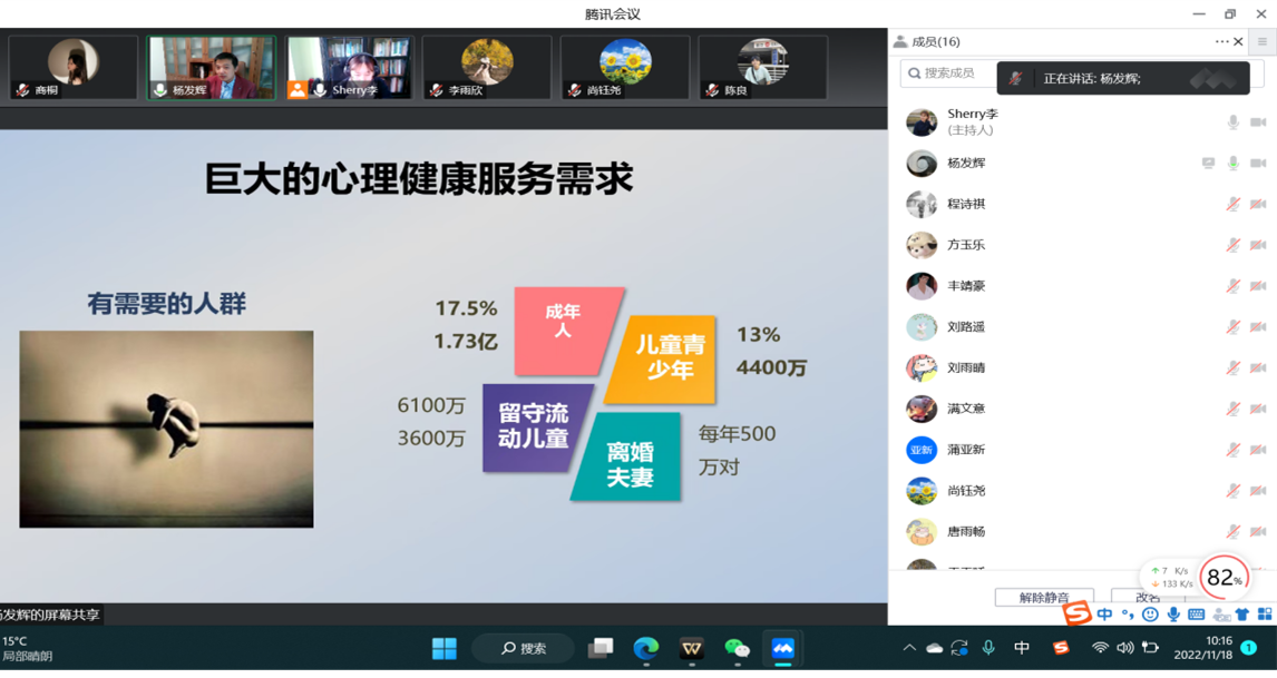 2022年11月18日,四川大学公共管理学院2022级应用心理专业的发展心理学的课堂上邀请到西南大学心理学部心理咨询研究与培训中心主任、中国心理卫生协会认证首批心理督导师,国际认知行为治疗学院认证认知行为治疗师、认知行为治疗培训师(督导师)杨发辉老师给同学进行线上讲座。