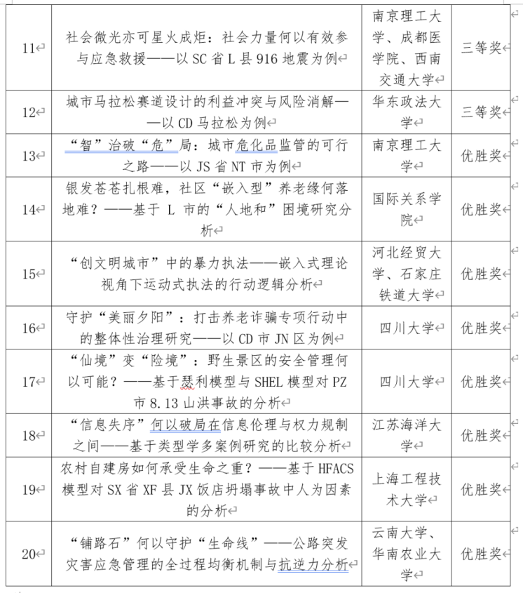 此外,由行政管理系李强彬教授指导,行政管理专业2020级本科生李翌阳、赵晓联、齐欣玉、郑永加,土地资源管理专业2020级本科生赖宇涵组成的“以赛促学队”完成的《“仙境”变“险境”:野生景区的安全管理何以可能?——基于瑟利模型与SHEL模型对彭州8·13山洪事故的分析》和由行政管理系刘超老师指导,劳动与社会保障专业2020级本科生韦雅琳,行政管理专业2020级本科生李泽芳、刘春雨、林云鹏完成的《守护“美丽夕阳”:打击养老诈骗专项行动中的整体性治理研究——以成都市金牛区为例》获得了大赛优胜奖。