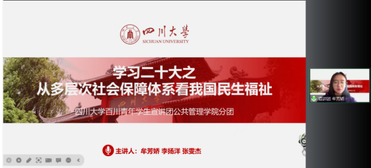 接着,百川青年学生宣讲团公共管理分团成员牟芳娇、张雯杰、李扬洋围绕“从多层次社会保障体系看我国民生福祉”深入讲解二十大精神。宣讲较为深入地展现了中国在多层次社会保障体系建设方面做出的努力及发展趋向,充分展现了中国式现代化对增进民生福祉的不懈追求。问答互动后本次团校圆满结束。