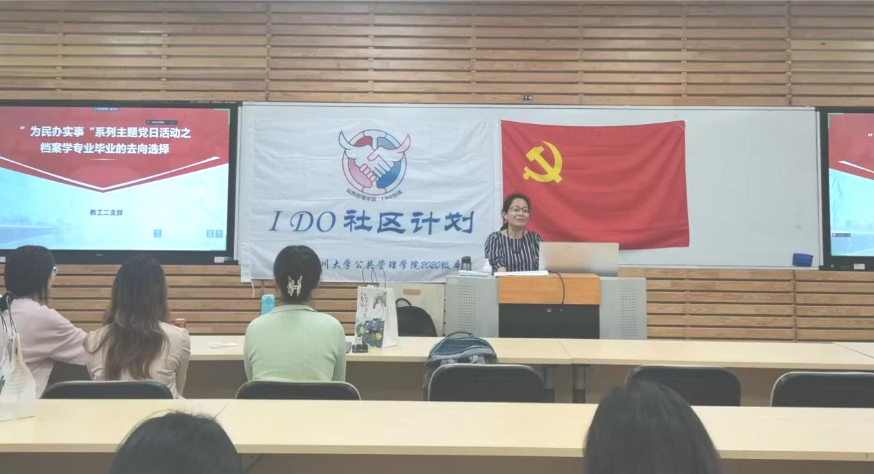 为落实“我为群众办实事”系列党日活动要求,实现党建引领专业发展和人才培养的工作目标,加深档案学专业同学对考研、保研、出国深造、就业等方面的了解,4月21日下午,公共管理学院教工二支部于望江校区基教A308教室举行了“为民办实事”系列主题活动之“档案学专业毕业的去向选择”专业交流活动。活动由秘书档案学系系主任王萍教授主讲,教工二支部书记赵跃副研究员主持,档案学专业20级全体同学和19级、21级、22级部分同学参加。