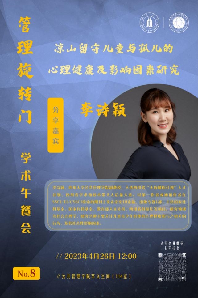 近日,四川大学公共管理学院在学院萃文空间成功开展第八期“管理旋转门”学术沙龙活动。本期学术沙龙特邀我院李诗颖副教授作为主讲嘉宾分享“凉山留守儿童与孤儿的心理健康及影响因素研究”研究主题。学院各学科老师、研究生积极参加了此次交流。本期学术沙龙由王慧敏副研究员担任学术主持。
