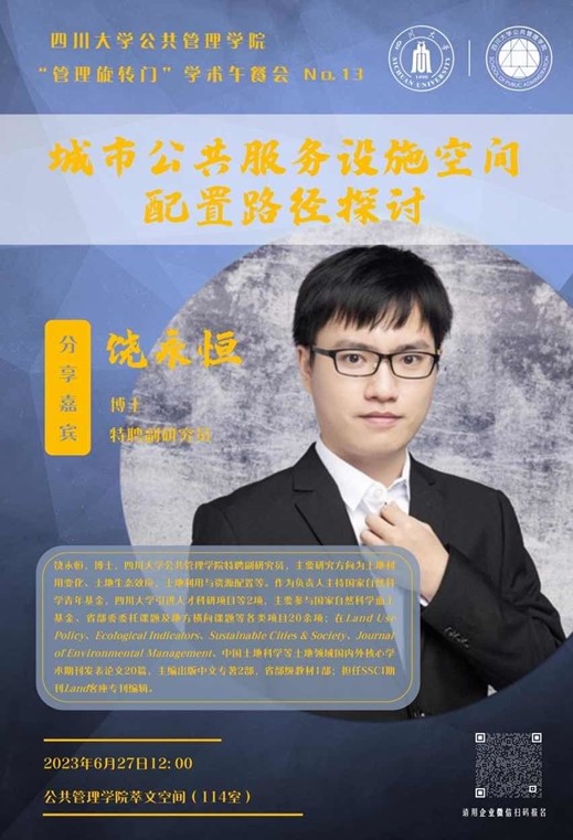 近日,公共管理学院在学院萃文空间成功开展第13期“管理旋转门”学术沙龙活动。本期学术沙龙特邀四川大学公共管理学院特聘副研究员饶永恒老师作为主讲嘉宾分享“城市公共服务设施空间配置路径探讨”,学院各学科老师、博士研究生积极参加了此次交流。