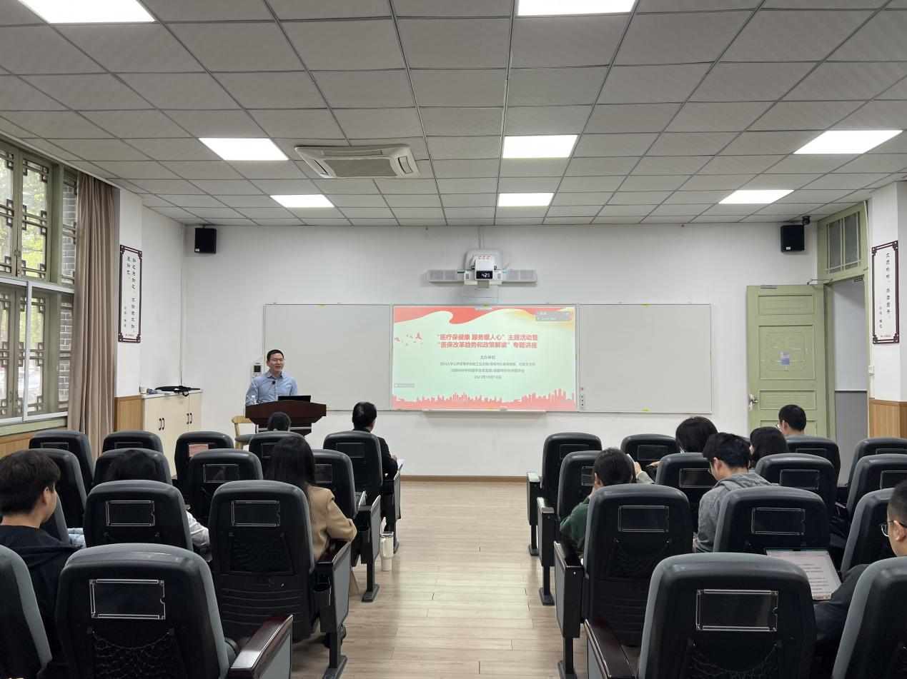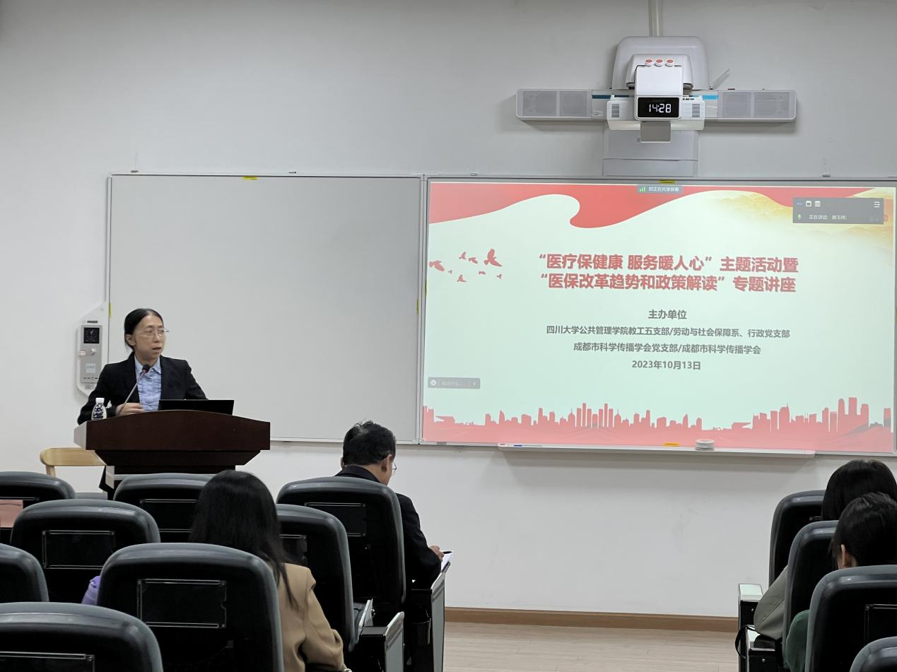 为促进党建与学科建设融合发展,进一步服务广大师生,切实推动主题教育走深走实,四川大学公共管理学院教工五支部/劳动与社会保障系,行政党支部,成都市科学传播学会及支部于10月13日下午2:30在四川大学望江校区公共管理学院共同举办了“医疗保健康,服务暖人心”主题活动暨“医保改革趋势和政策解读”专题讲座。本次活动邀请了教工五支部黄国武副教授进行分享,支部同志及校内外师生、科技工作者通过线上线下方式参加了此次活动,教工五支部吴敏教授主持活动与讲座,学院党委书记韩杰同志莅临指导。