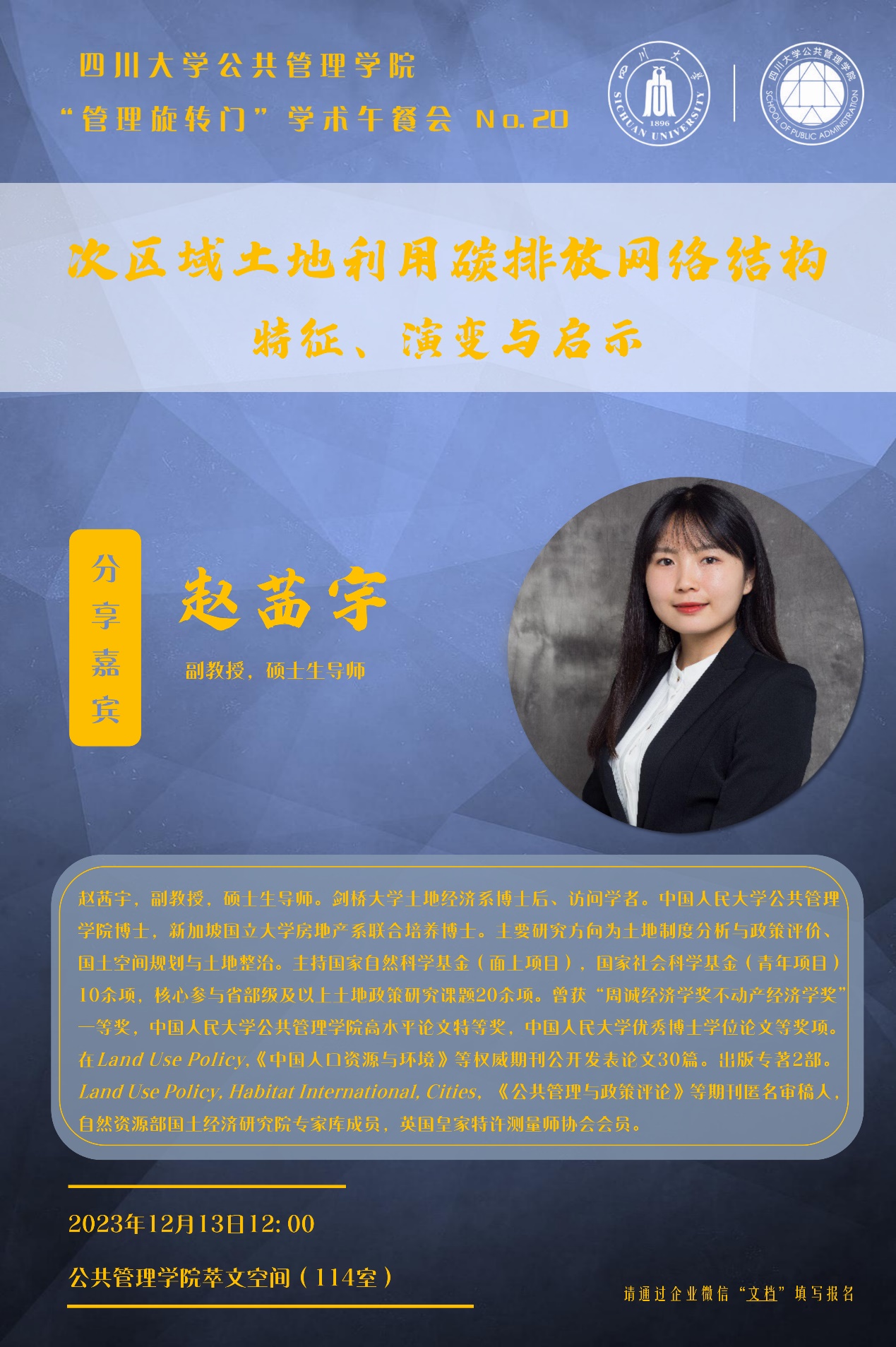 12月13日,公共管理学院在学院楼萃文空间成功开展第二十期“管理旋转门”学术沙龙活动。此次学术沙龙特邀剑桥大学土地经济系博士后、访问学者赵茜宇副教授分享“次区域土地利用碳排放网络结构:特征、演变与启示”,学院各学科老师、硕博研究生积极参加了此次跨学科交流。本期沙龙由劳动与社会保障系田益豪副研究员担任学术主持。