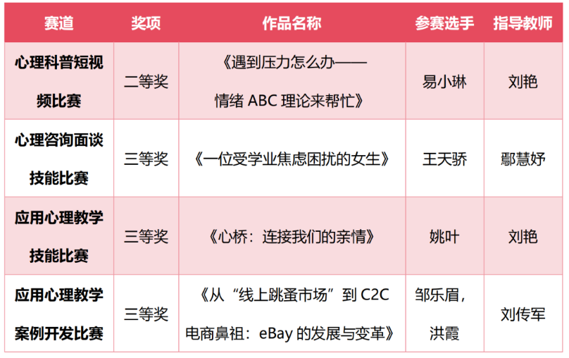 四川大学公共管理学院应用心理专业硕士生积极参与本次大赛,在刘传军、刘艳、谷建岭和汤万杰四位老师的指导下,共计4件作品进入复赛,经过层层角逐,4份作品均取斩获佳绩。