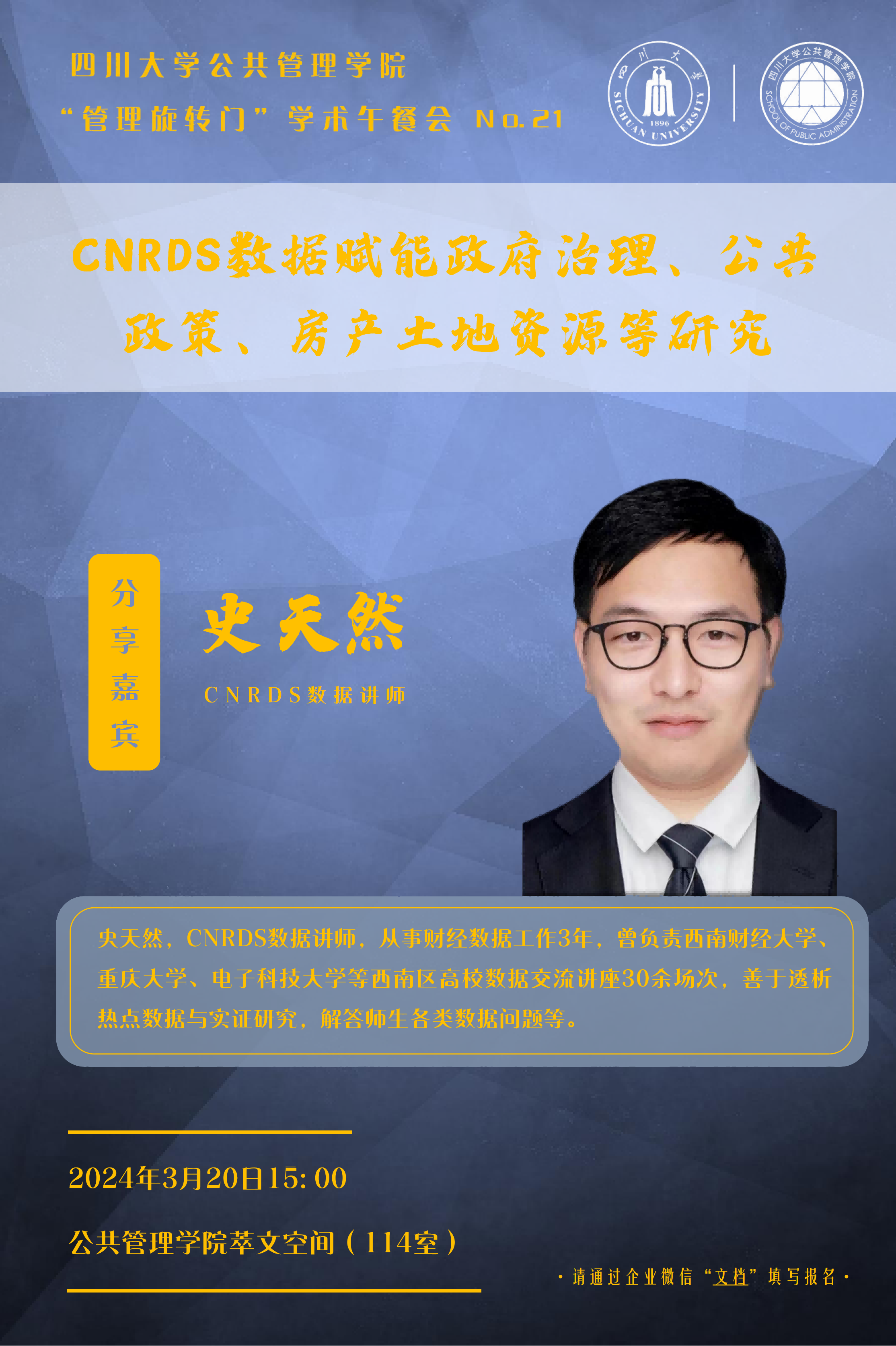 近日,公共管理学院在学院萃文空间成功举办第21期“管理旋转门”学术沙龙。本次活动特邀CNRDS(中国研究数据服务平台)数据讲师史天然老师进行了题为“CNRDS数据赋能政府治理、公共政策、房产土地资源等研究”的学术分享。本期学术沙龙由行政管理系刘磊教授担任学术主持。