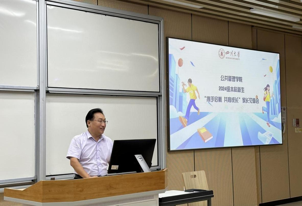韩杰向与会家长详细介绍了四川大学及公共管理学院的历史沿革,展现了学校丰硕的研究成果、优质的教育资源与先进的育人理念。韩杰表示,学院将始终践行“公成天下,管法自然”的院训,进一步发挥多学科交叉优势,培养高层次、复合型、应用型的公管人才。