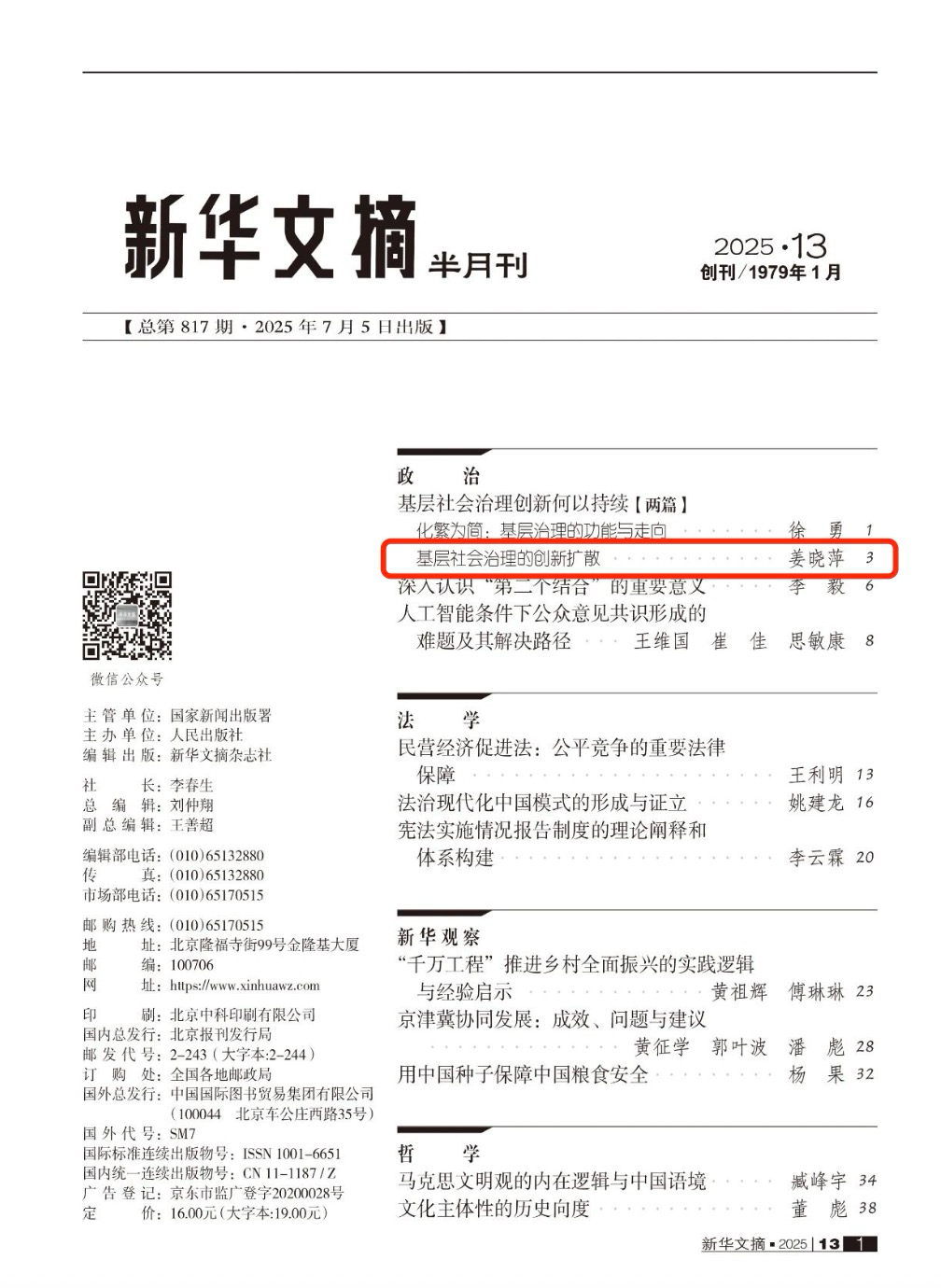 7月出版的《新华文摘》(2025年第13期)转载了我院姜晓萍教授的论文《基层社会治理的创新扩散》。