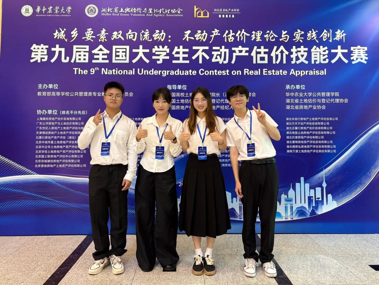 近日,第九届全国大学生不动产估价技能大赛决赛在华中农业大学圆满落幕。在廖喜生老师的指导下,我院2022级土地资源管理专业本科生杨健祎、张佩芝、唐家玉、王昱昊凭借参赛作品《广元市剑阁县普安镇水池村冬枣水果林市场价值评估》表现出色,最终荣获大赛一等奖。