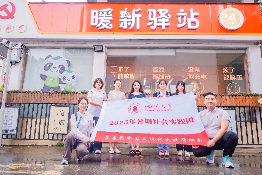 为深入学习贯彻习近平新时代中国特色社会主义思想,落实党的二十大精神、二十届三中全会精神和中央城市工作会议精神,深刻领会习近平总书记关于新就业群体的重要讲话重要指示精神,切实加强对新就业群体的关心关爱,提升新就业群体的归属感与幸福感,充分了解成都市暖新驿站的运营情况和先进经验,2025年7月7日—14日,四川大学公共管理学院“蓉城暖驿·青春护新”实践团前往成都市武侯区红牌楼街道暖新驿站、新津区五津街道暖新驿站、双流区东升街道棠湖中心暖新驿站等10个暖新驿站开展实践调研。