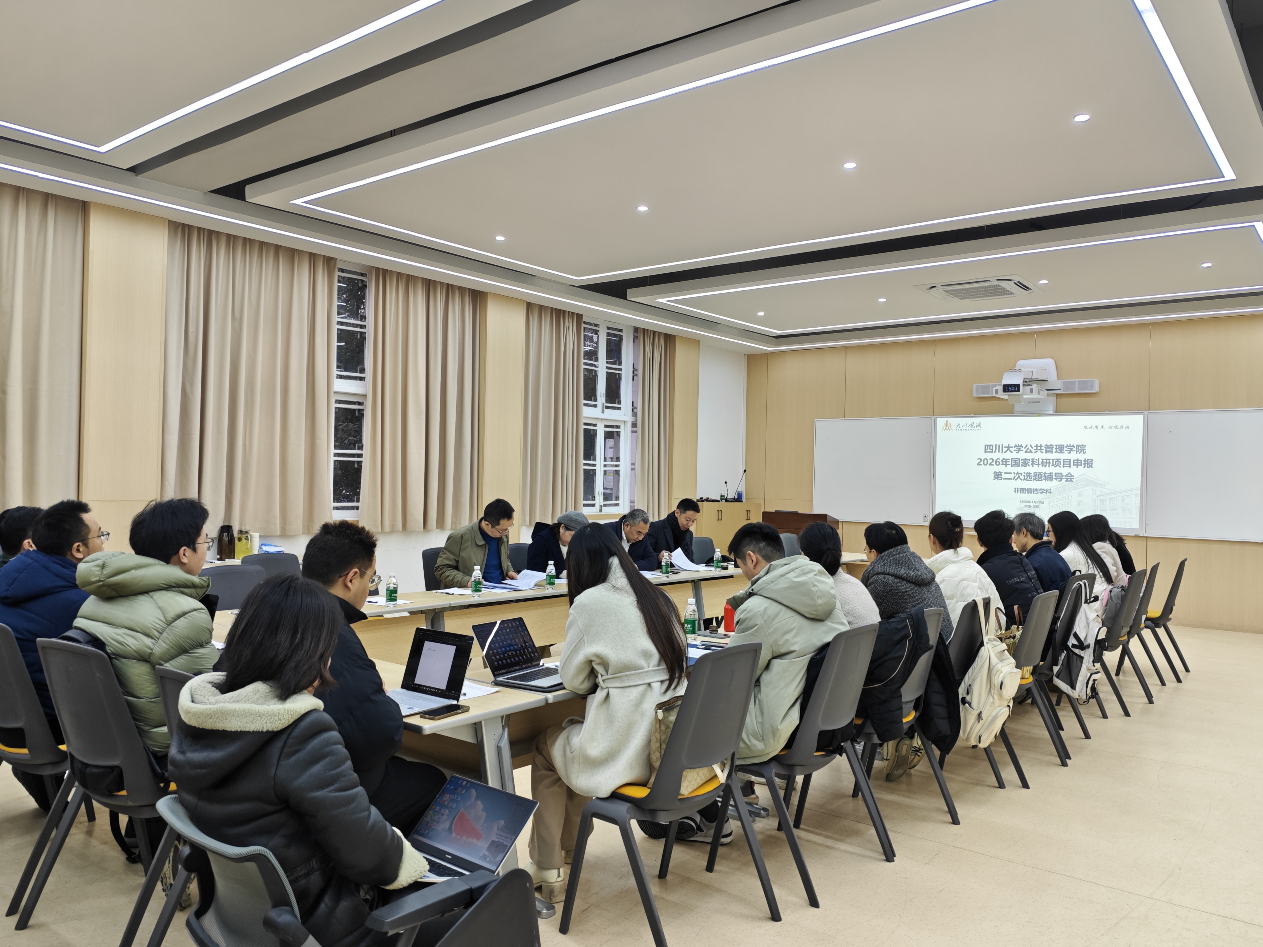 1月29日,公共管理学院在萃文楼214教室举办2026年国家级项目公共管理学等学科的第二轮选题辅导会,本次辅导会邀请夏志强教授、范逢春教授、王卓教授、李强彬教授为辅导专家。会议由范逢春教授主持,学院拟申报2026年国家科研项目公共管理学等学科的二十余位教师参加了会议。
