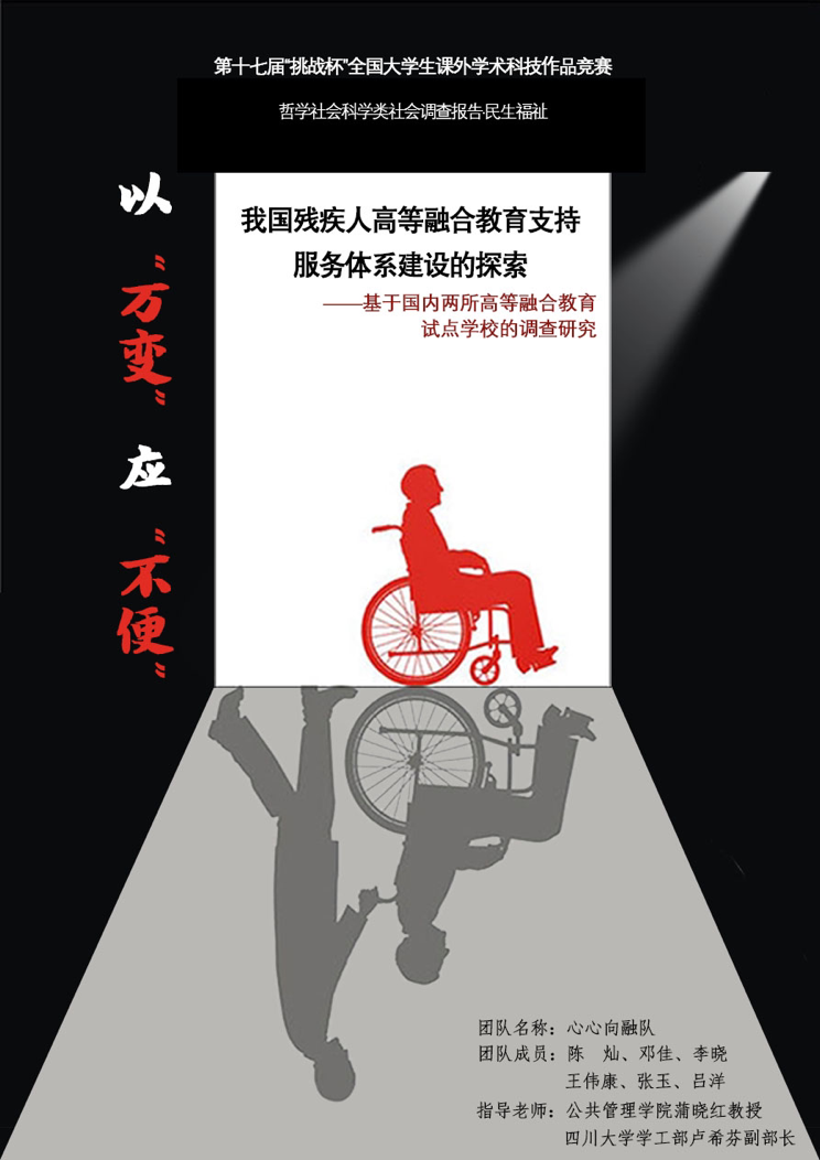 4月9日下午,“挑战杯”四川大学2020-2021年度学生课外学术科技作品竞赛获奖名单出炉,我院劳动与社会保障系2018级本科生陈灿带领“心心向融”队完成的作品——“我国残疾人高等融合教育支持服务体系建设的探索——基于国内两所高等融合教育试点学校的调查研究”获民生福祉类一等奖。该项目团队由公共管理学院劳动与社会保障系2018级学生陈灿、邓佳、李晓、王伟康和华西药学院2018级学生张玉、艺术学院2019级学生吕洋组成,并由公共管理学院劳动与社会保障系蒲晓红教授和四川大学学工部副部长卢希芬老师担任指导老师。