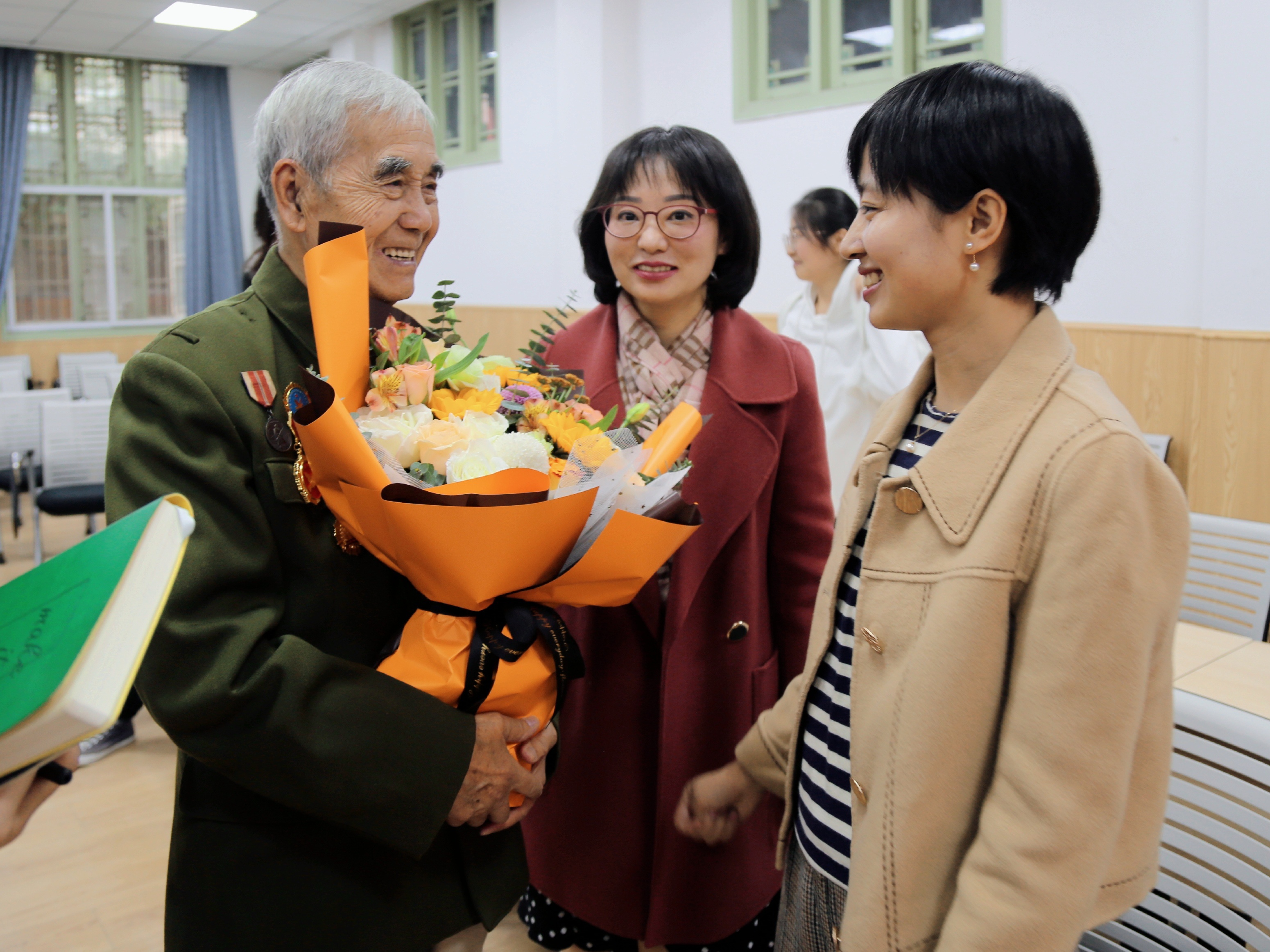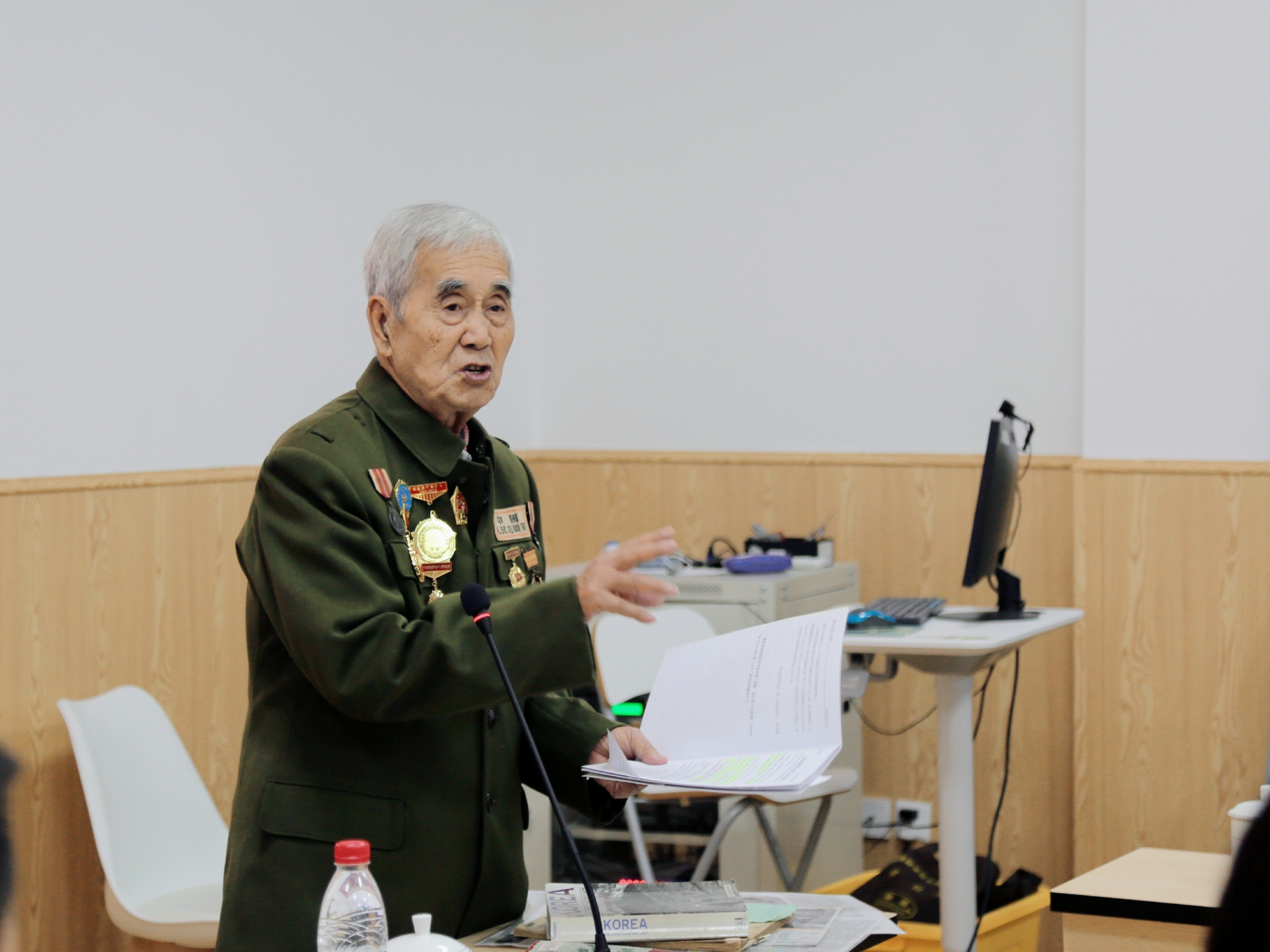 在罗亚玲副院长的介绍下,90高寿的莫若健老先生身着军装与勋功章,手拿记载他一生传奇的书籍和报纸,步伐坚定地走向讲台。站定后,莫老开心地向大家敬礼,在大家的掌声中开始了他的分享。90分钟的分享莫老全程站着讲完,动容之处不禁哽咽落泪,每一个细节都在传递着那段历史于个人于国家的重量。