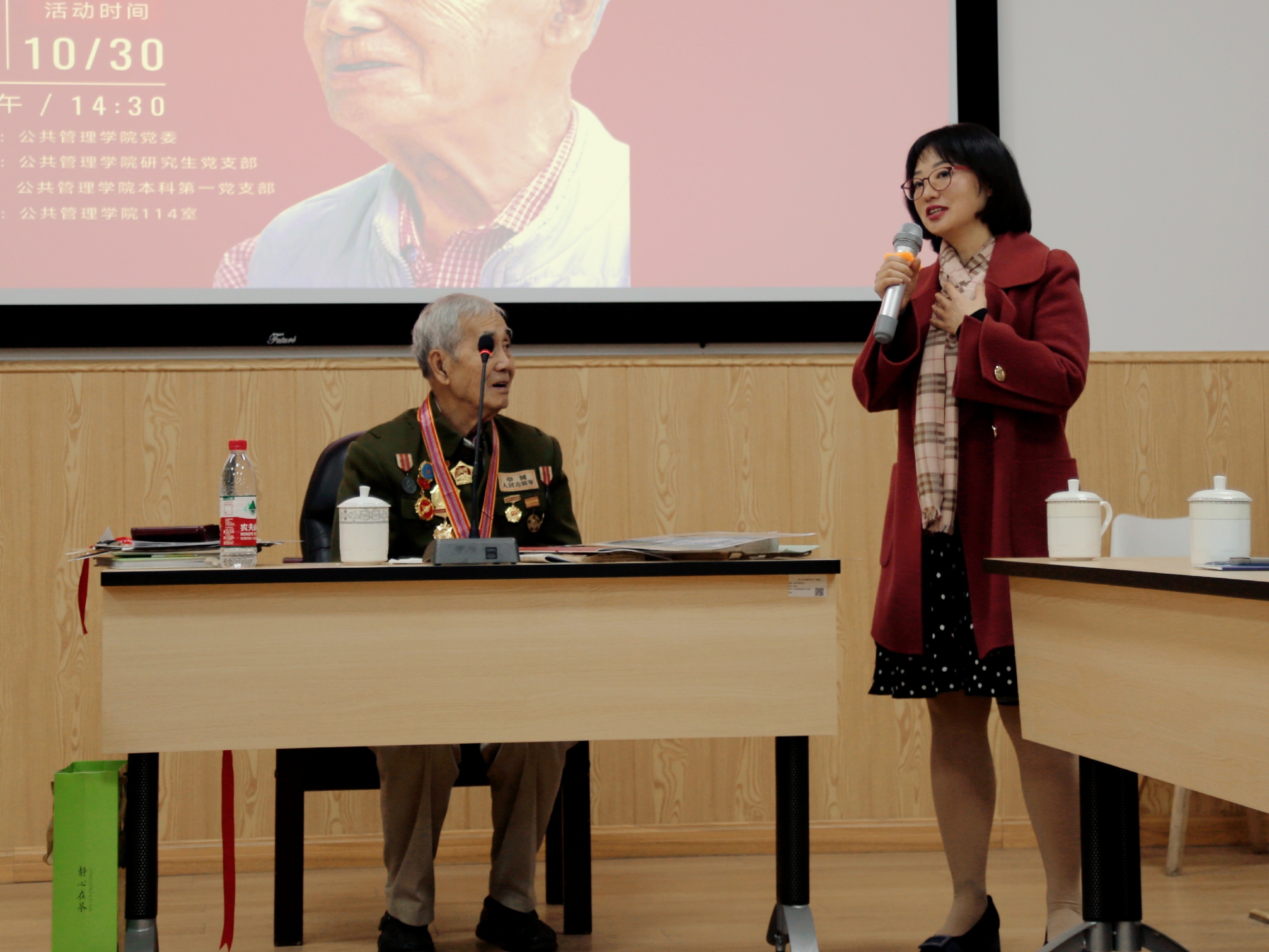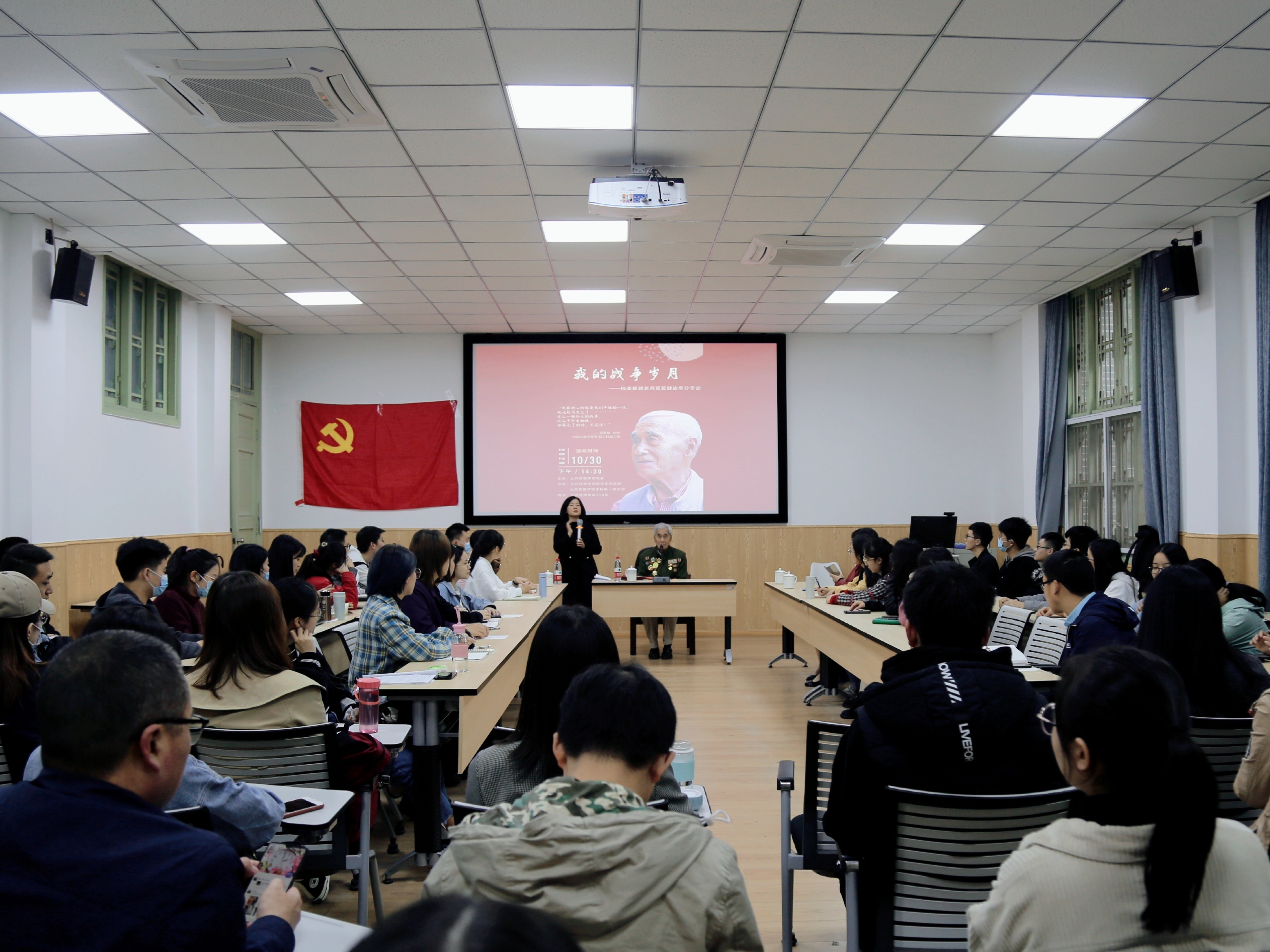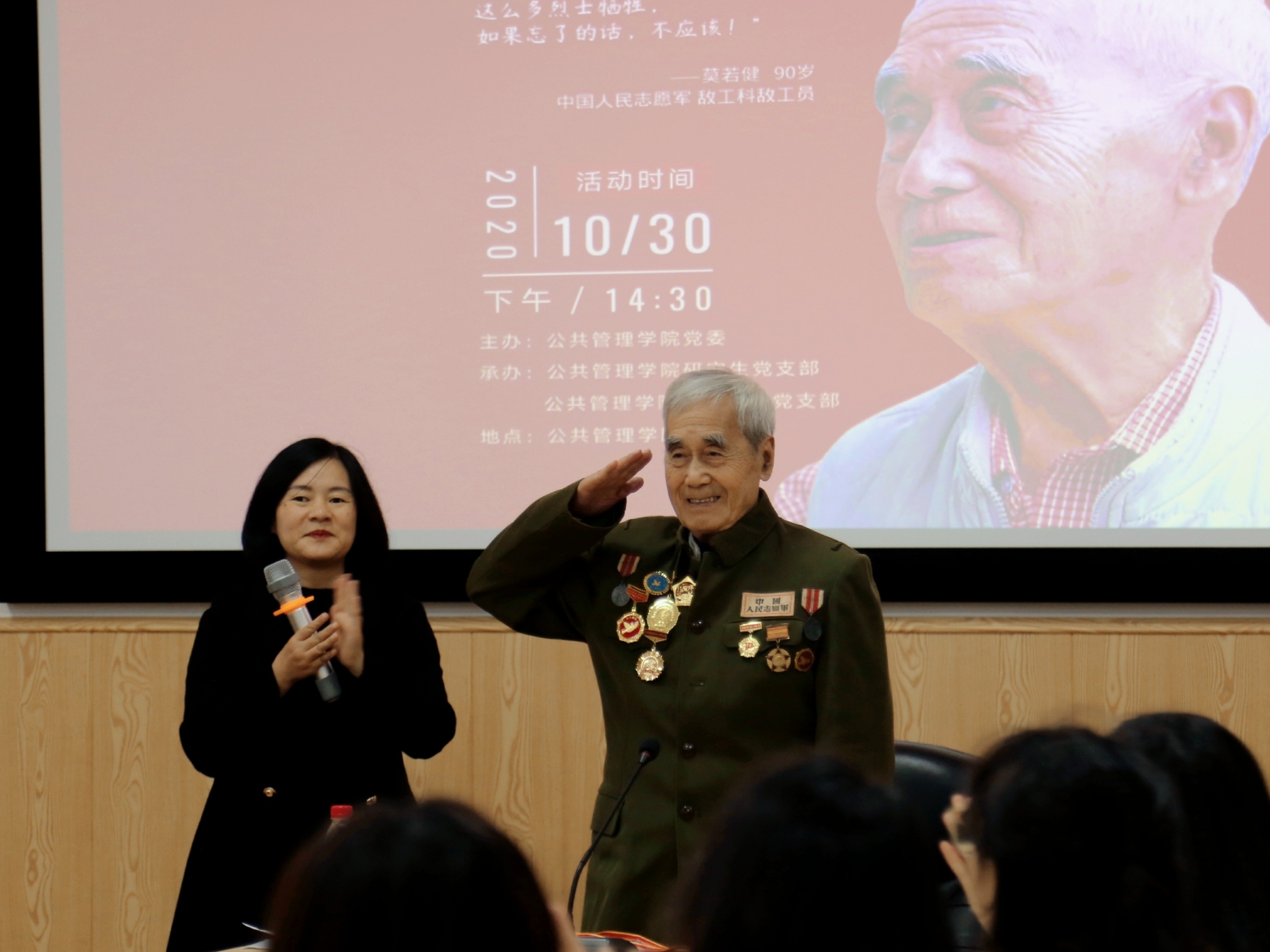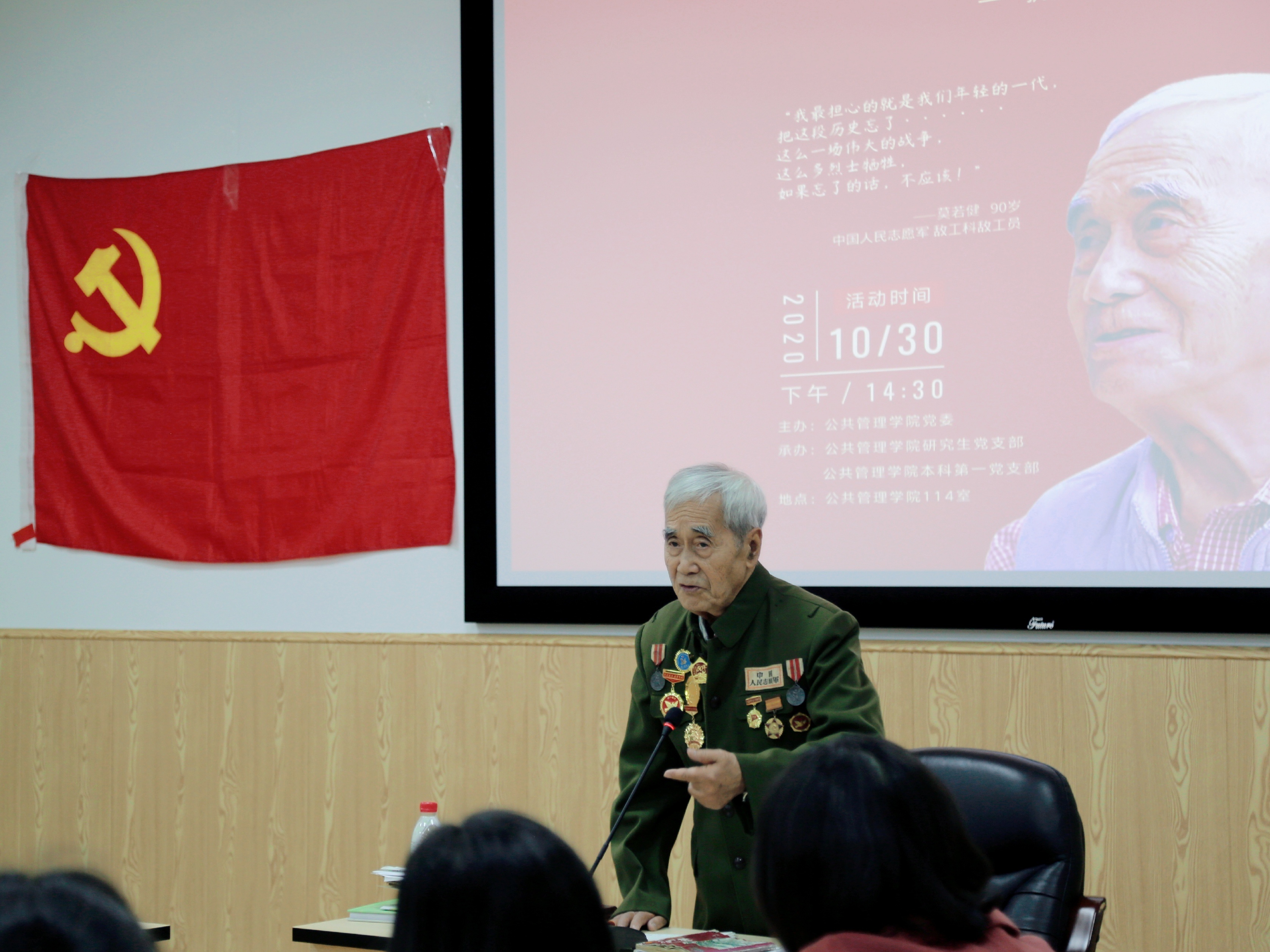 2020年10月30日下午2:30,公共管理学院“我的战争岁月——抗美援朝老兵莫若健故事分享会”主题党日活动在萃文楼114室成功举办,活动由公共管理学院副院长罗亚玲主持,学院专职组织员、2019级研究生第四党支部书记廖海燕,2020级研究生辅导员、本科第一党支部书记陈萱源和部分学生党员参加了此次活动。