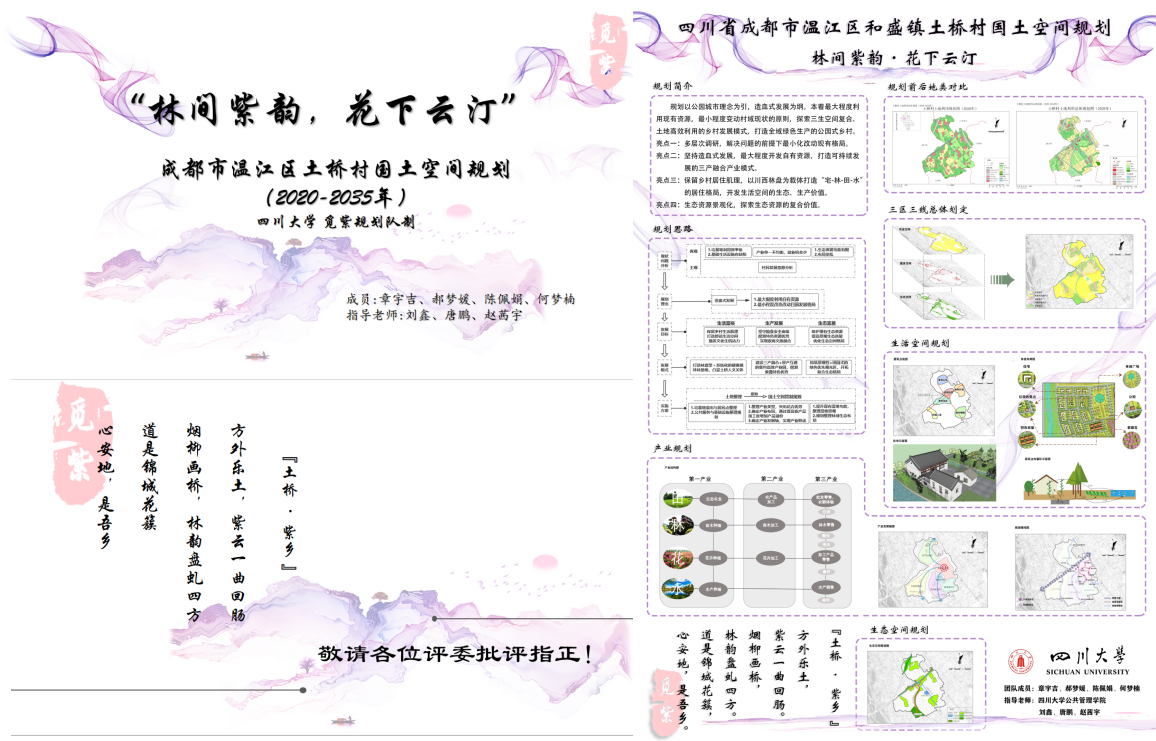 觅紫规划队成员在土管系老师的精心指导下,充分利用周末以及假期时间,通过多次实地调研获取土桥村一手数据,对村庄的现状、问题等深入剖析,利用多种分析方法和专业技术手段,在公园城市和造血式发展的理念指引下,打造三生复合、产业融合发展的公园式乡村,完成了成都市温江区土桥村的国土空间规划作品。通过本次大赛,学生们将理论知识真正运用到实践中,在实践中又总结经验、得到启发,这对本科专业的学习起到了极大的促进作用。