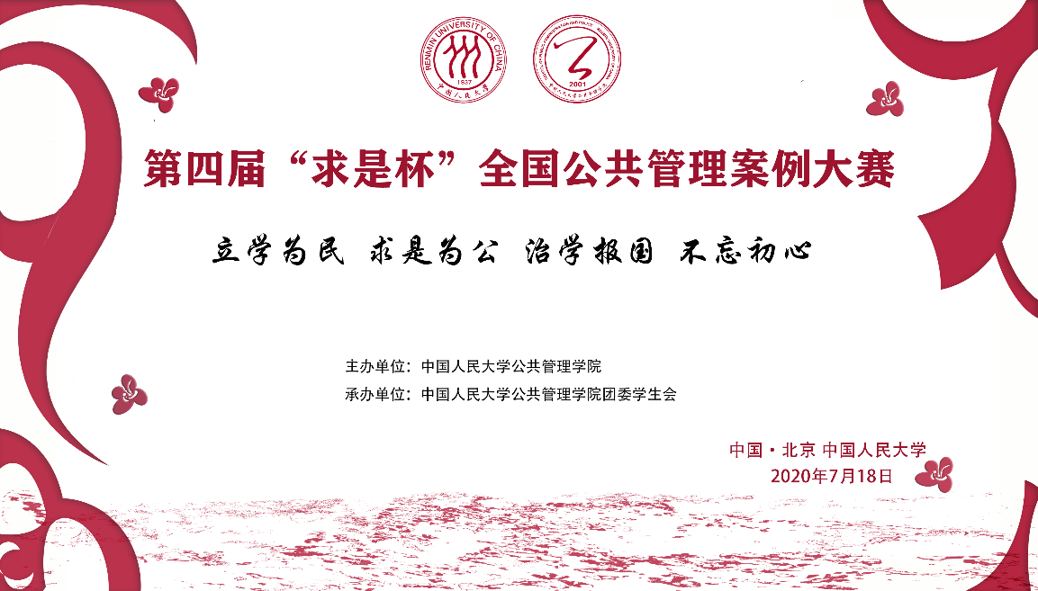 “求是杯”全国公共管理案例大赛是由中国人民大学公共管理学院主办的,面向本科生的全国性公共管理类案例大赛。大赛旨在促进高校学生交流,培养学生“求是为公,知行合一”的品质,提升学生的发展力和竞争力。大赛鼓励学生积极投身公共管理实践,提高其发现问题、分析问题、解决问题的能力,为公共政策制定和国家治理建言献策。